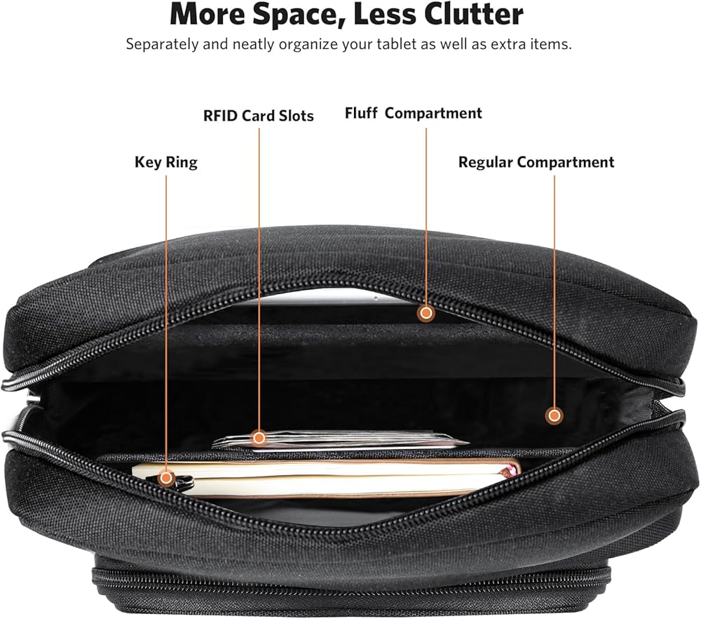 A total of four compartmentalized pockets, the main pocket has a flat storage space, RFID function card slot, key ring (AirTag can also be hung), and a pocket for storing other accessories; The front pocket can store two stylus pens and other small accessories.