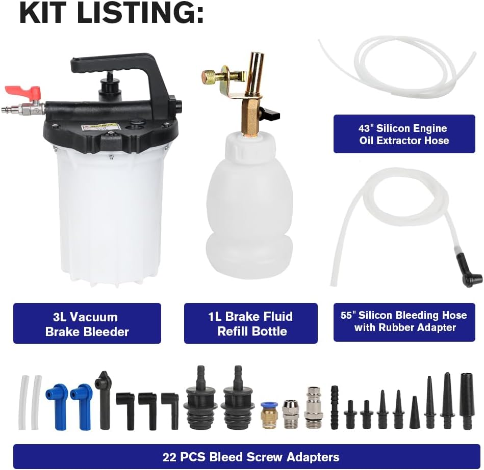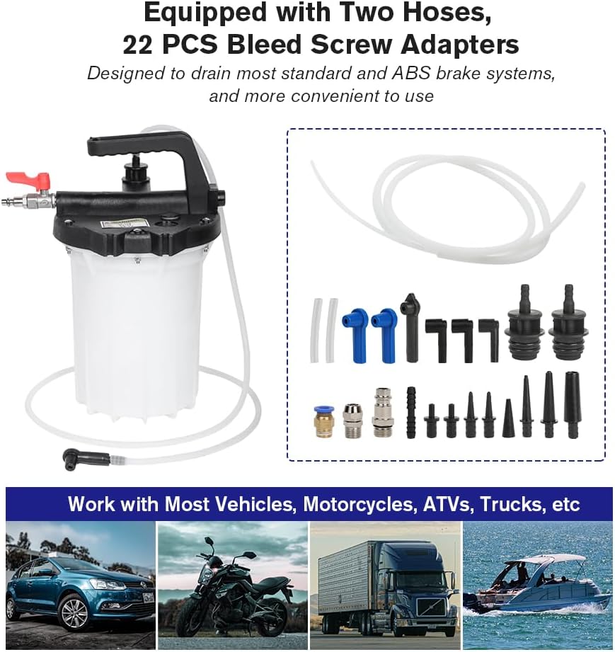 The brake bleeder kit contains everything you need to get the job done: a vacuum bleeder pump, brake fluid reservoir, various adapters to fit any vehicle, and a flexible hose. The kit is compatible with all types of vehicles, including cars, trucks, motorcycles, and ATVs.