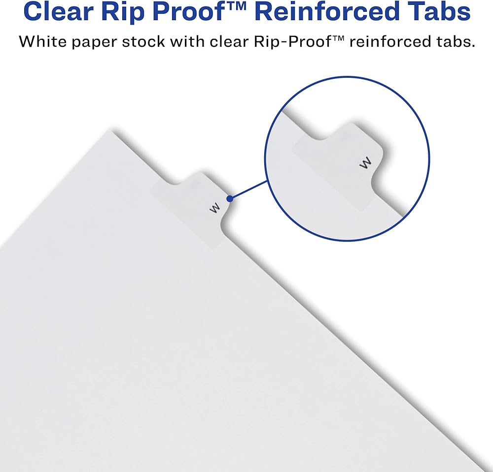 Here's a way to present your case in a clear and organized manner. Use these Avery Individual Legal Dividers - Allstate Style to bring order to your index briefs, legal exhibits, mortgage documents and more. Each set includes 25 identical dividers printed using Helvetica regular type so you can build the specific sections you need. White paper stock with clear Rip Proof reinforced, dual-sided tabs make it easy to organize your information. The binding edge is unpunched, so these dividers can fit practically any binding system. You'll go on the record for having neat and orderly files.