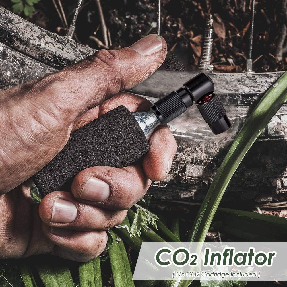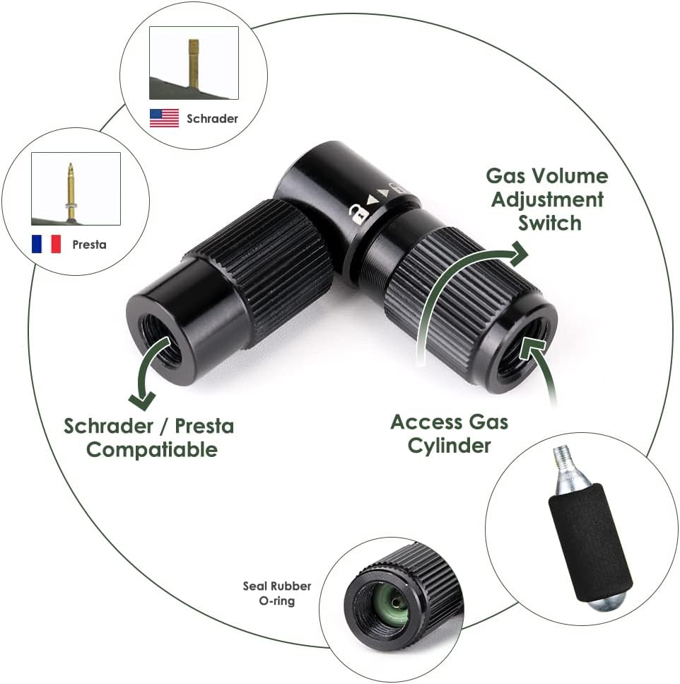 توافق عالمي --- تم تصميم رأس النفخ لجميع خراطيش ثاني أكسيد الكربون الملولبة التي تبلغ 12/16/20/25 جم (غير متضمنة). والرأس الآخر لمنفاخ ثاني أكسيد الكربون هذا متوافق مع صمامات بريستا وشرايدر، وهو مثالي لإطارات الدراجات على الطرق والجبل والمدينة.