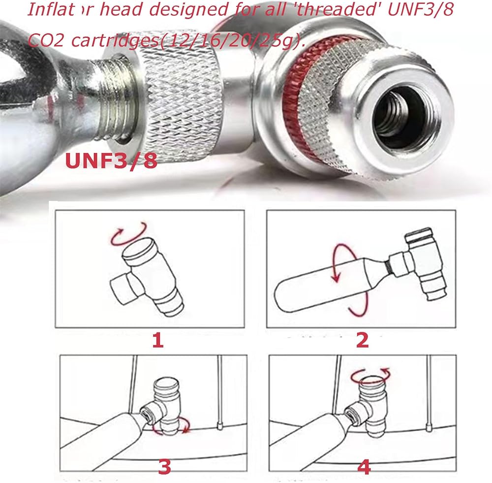 ✨Secure Connection with No Leaks: Our bike tire inflator head is designed with a threaded connection that ensures a safe and secure fit. It can be adapted for any size of threaded CO2 cartridges (12g, 16g, 20g & 25g), CO2 cartridges NOT included.and is compatible with any valve type(Presta & Schrader valves ).