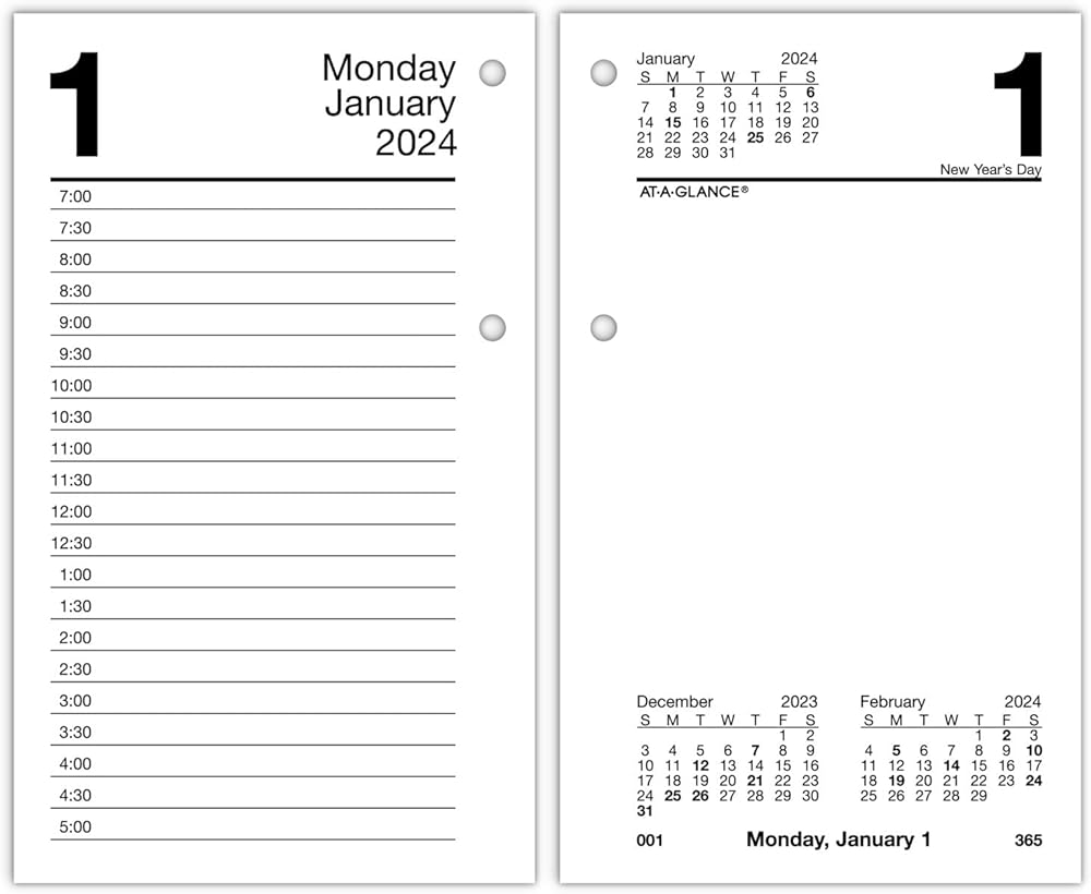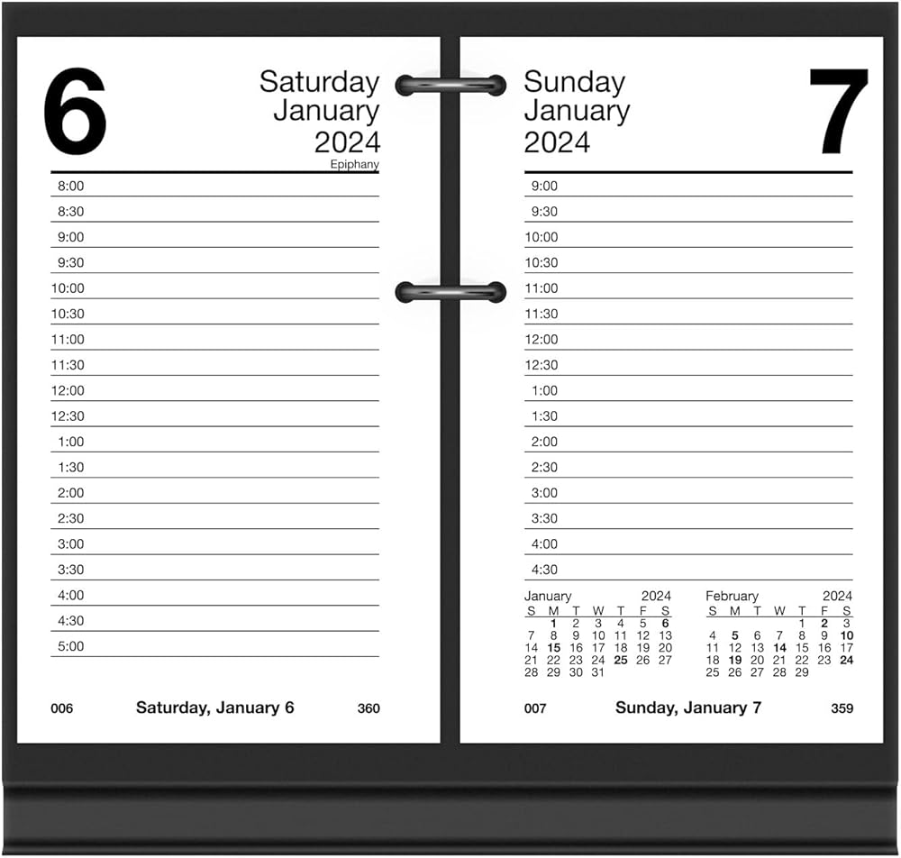 نظرة عامة يومية - يحتوي يوم واحد على صفحتين مع أوقات المواعيد المحددة على جانب ومساحة تخطيط مفتوحة على الجانب الآخر. مقاس الصفحة 3-1/2 انش × 6 انش.