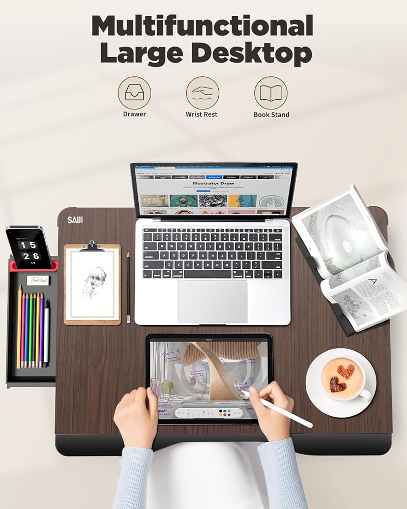 【حجم سطح مكتب كبير جدًا】: مثالي لطلاب المدارس والجامعات والدراسة والعمل واللعب وأساسيات غرفة النوم من SAIJI مقاس سطح المكتب 25.6 بوصة × 19.29 بوصة، يناسب الكمبيوتر المحمول حتى 17 بوصة. سطح مكتب كبير جدًا يحافظ على الكمبيوتر المحمول الخاص بك، يسهل الوصول إلى الكتب المدرسية والماوس والهاتف الذكي. يبلغ ارتفاع هذا المكتب 10.6 بوصة، ومساحة كبيرة لساقيك، مما يسهل ثني وتمديد ساقيك لمزيد من الراحة في السرير أو الأريكة.