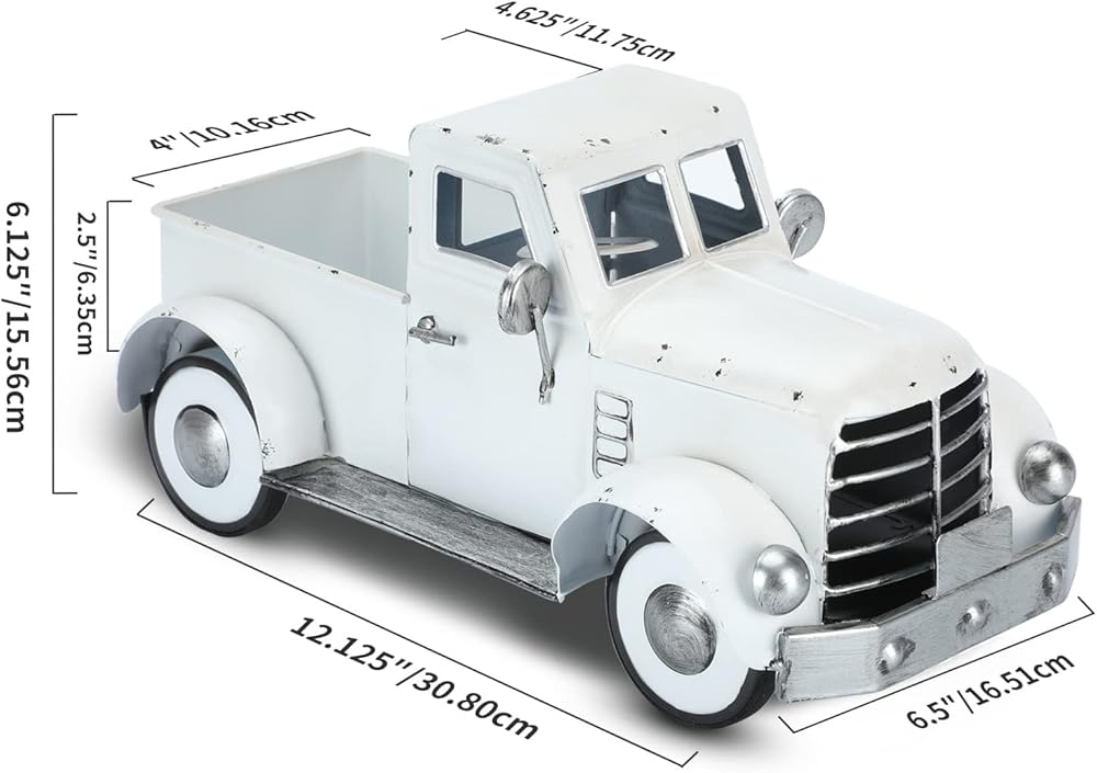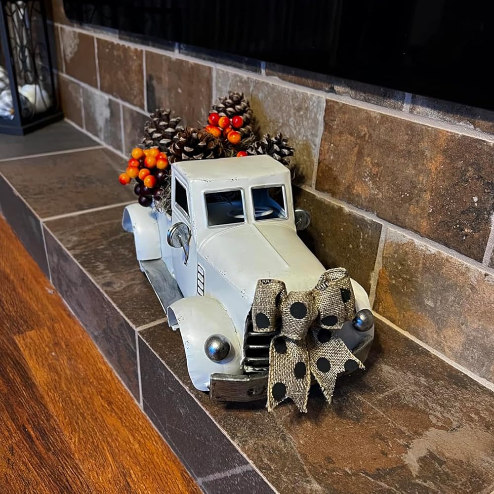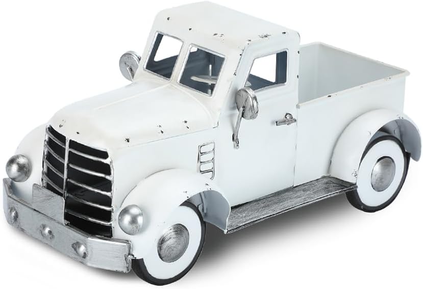 This white country farm truck displays nicely on kitchen, living room, mantel, bookshelves, garage, office, shop and so on.