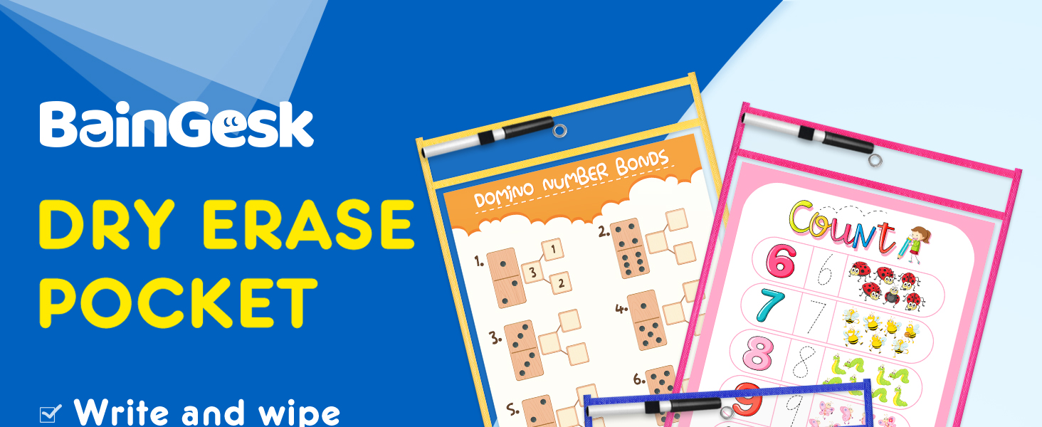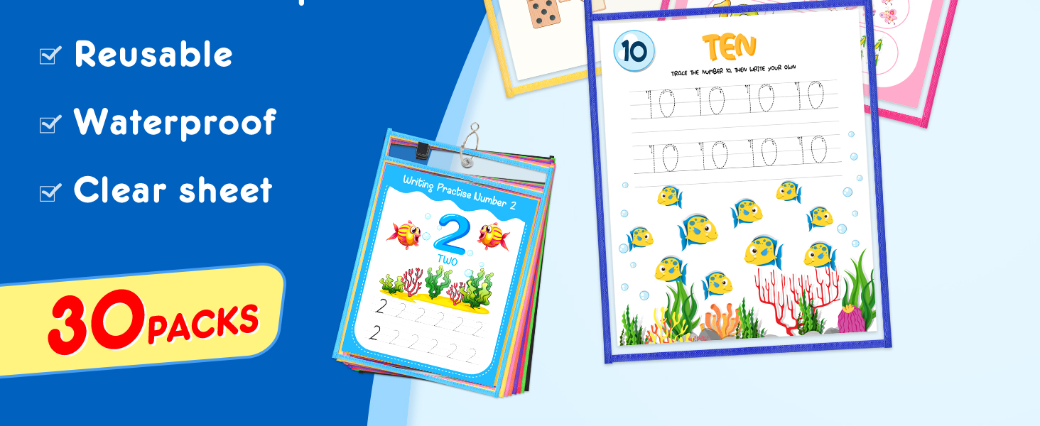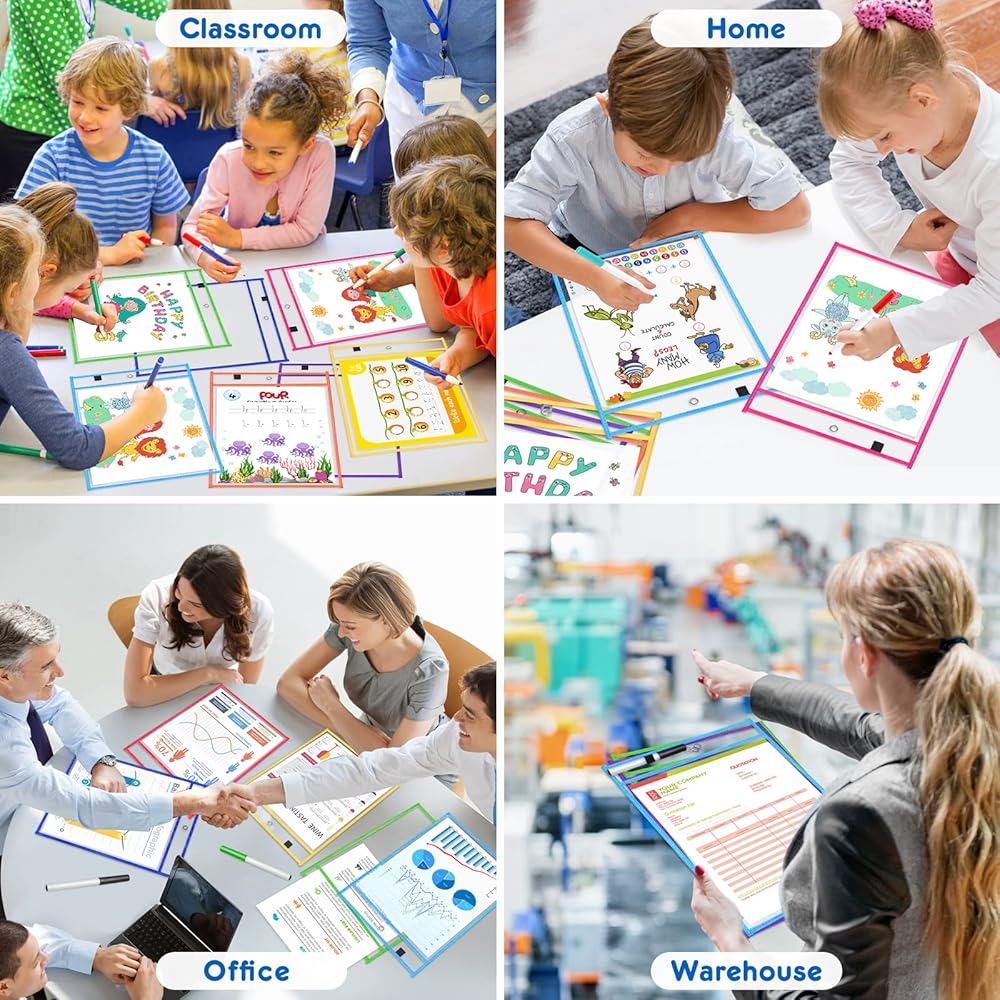 • مجموعة جيوب المسح الجافة كبيرة الحجم - 30 عبوة من جيوب المسح الجافة كبيرة الحجم مع حلقتين. تصميم كبير الحجم (10 × 14 بوصة) مع 10 ألوان لإدراج وإزالة معظم الأوراق القياسية بشكل أنيق ويناسب معظم أنشطة الفصل الدراسي.