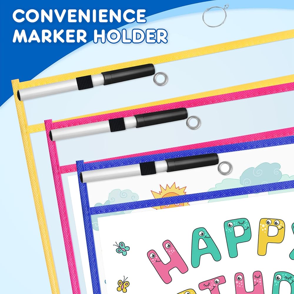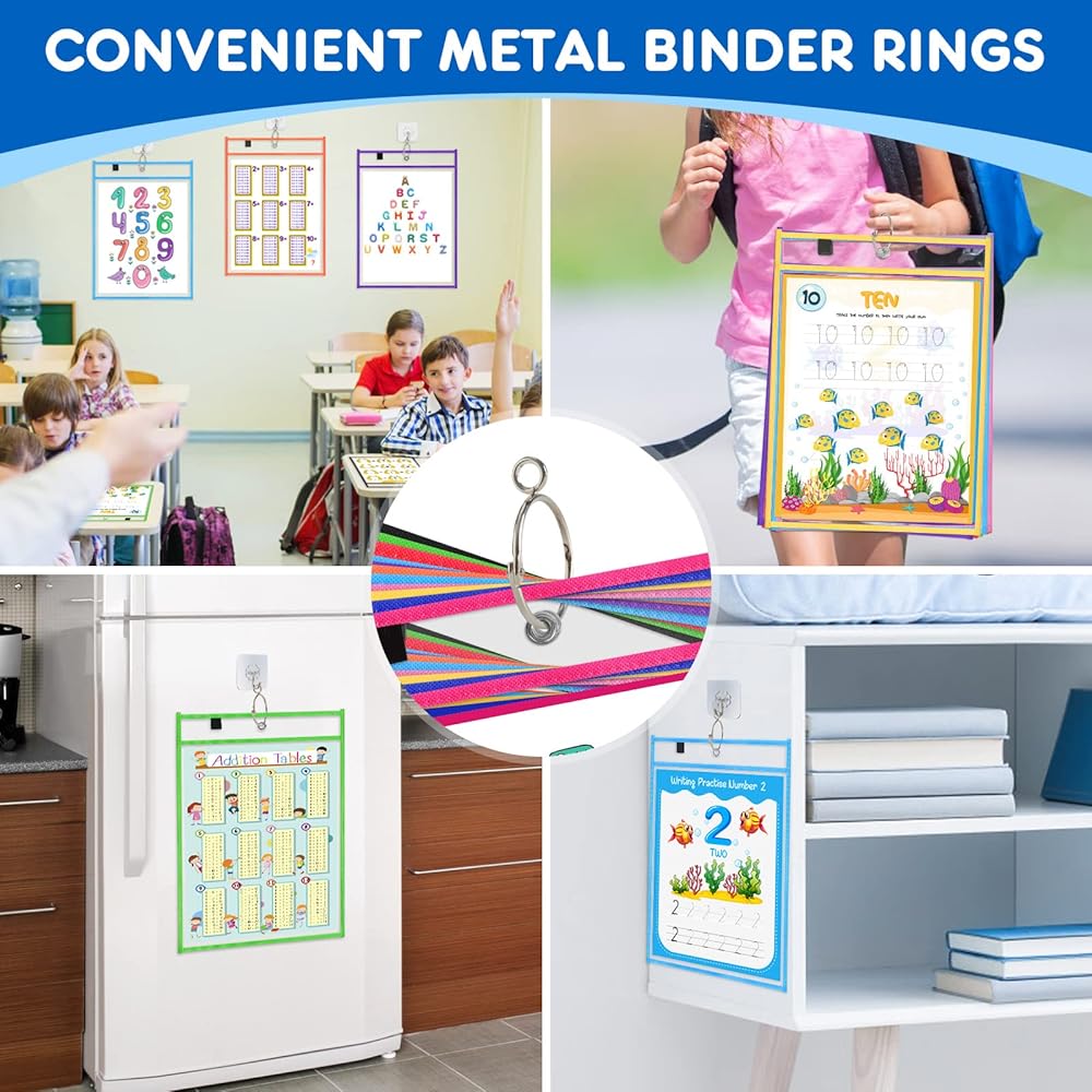 • سهولة التعليق والفرز - تحتوي أكمام الجيب الشفافة على حلقات معدنية تستخدم حلقتين معدنيتين، لذلك يمكنك تصنيفها بسهولة. حلقتان تساعدك على فرزها بسهولة وتعليقها على الحائط أو مكتب الطلاب. لديهم أيضًا حوامل أقلام تحديد مرنة لتخزين أحجام مختلفة من أقلام التحديد.