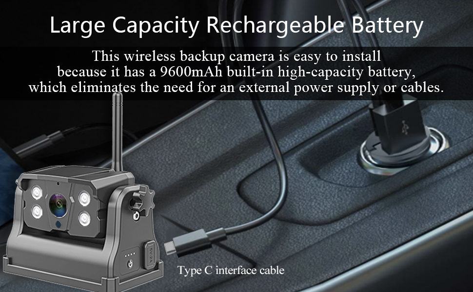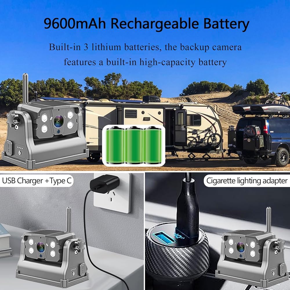 · تتميز كاميرا RV ببطارية مدمجة عالية السعة، مما يجعلها لاسلكية حقًا وتزيل الحاجة إلى مصدر طاقة إضافي. ما عليك سوى شحنه باستخدام شاحن هاتف بقوة 5 فولت وسلك الطاقة من النوع C المرفق.