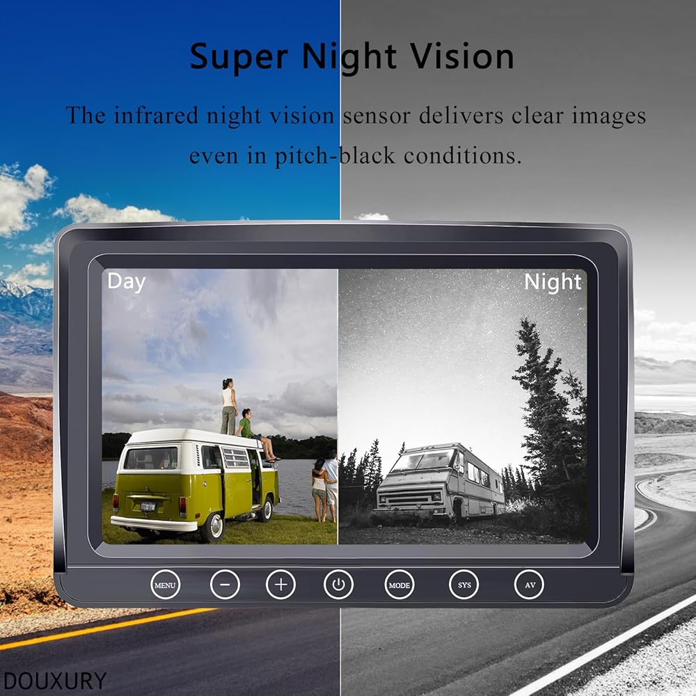 · تم تجهيز الكاميرا الاحتياطية المزودة بشاشة مقاس 7 بوصات برؤية ليلية فائقة الجودة بالأشعة تحت الحمراء، وذلك بفضل شريحة الاستشعار بالأشعة تحت الحمراء. تعمل تقنية IR LEDs على توسيع نطاق المشاهدة حتى 50 قدمًا، مما يوفر رؤية ممتازة حتى في ظروف الظلام الدامس.