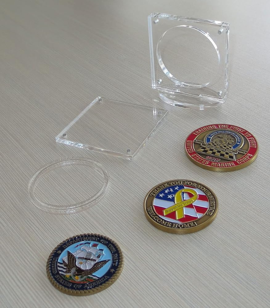 Designed to elegantly display all challenge coins military, corporate, antique.