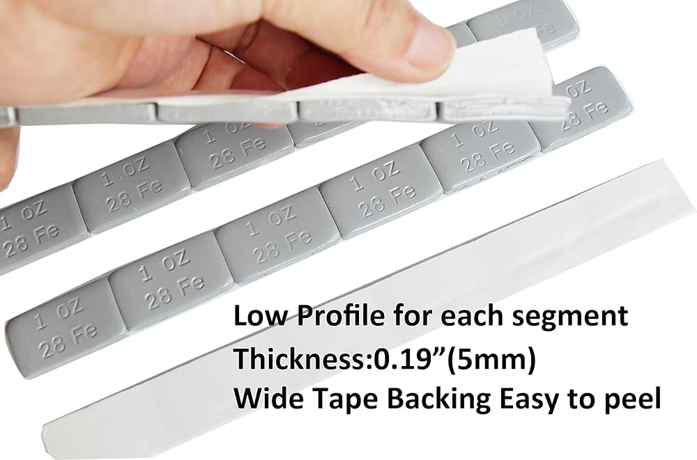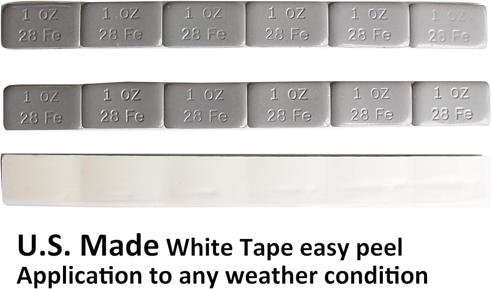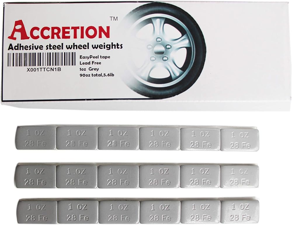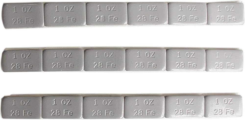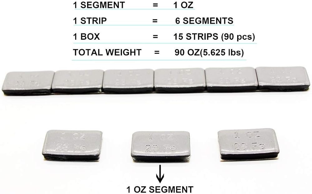 Accretion Lead free 1 oz wheel weights with adhesive backing. Completely Plastic Powder Coating in Black for the best rust prevention. Applies to cast aluminum and spoke wheels. White tape Backing, Easy to Peel, Holds Weight Securely and will not Come off in Extreme Conditions. 6 strips of 6-1 ounce weights per pack (36) pieces.