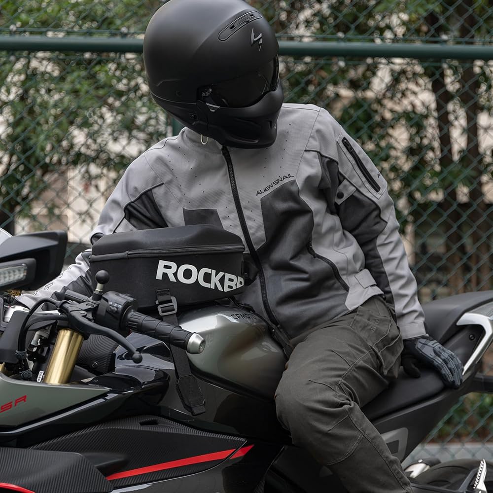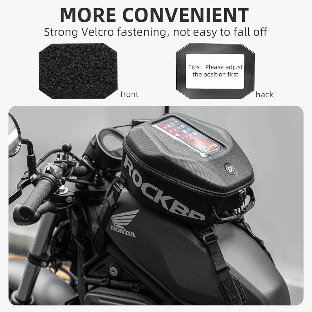 مقاومة للماء ومتينة: حقيبة خزان الدراجة النارية مصنوعة من قطعة واحدة من أسيتات إيثيلين-فاينيل (EVA) المصبوبة مع غطاء علوي من البولي يوريثان بنمط الكربون ثلاثي الأبعاد، والسطح ليس من السهل خدشه. مادة الغلاف الصلب EVA مقاومة للماء ومتينة، وتأتي مع غطاء مطر مخصص إضافي يحتوي على طبقة شفافة تعمل باللمس. بغض النظر عن كيفية تغير الطقس، فإن حقيبة خزان الغاز الخاصة بالدراجة النارية هي رفيق قادر على رحلتك.