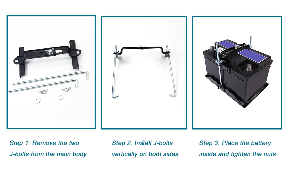 بطارية GEPHYNM مع الاستمرار، ربط البطارية العملي للسيارة، مجموعة تثبيت البطارية مع مسامير J مقاومة للصدأ مقاس 8 بوصات، حامل بطارية السيارة قابل للتعديل