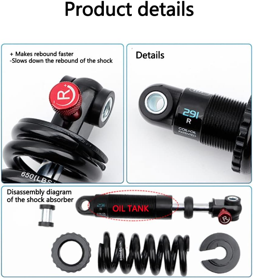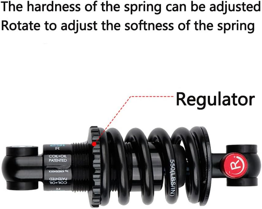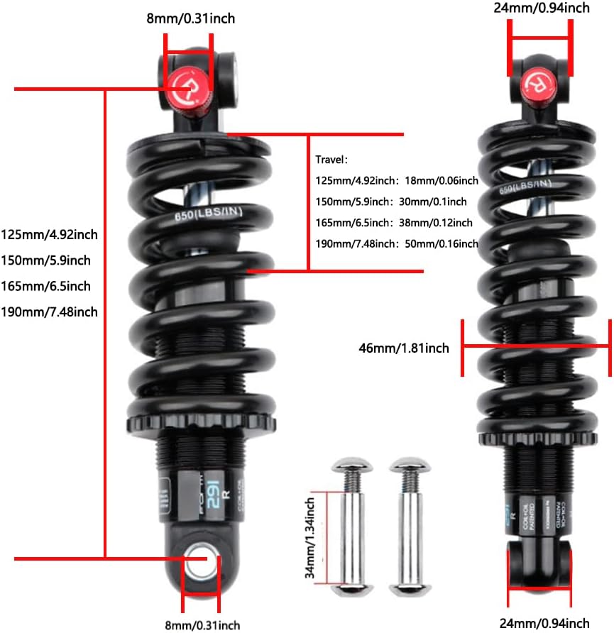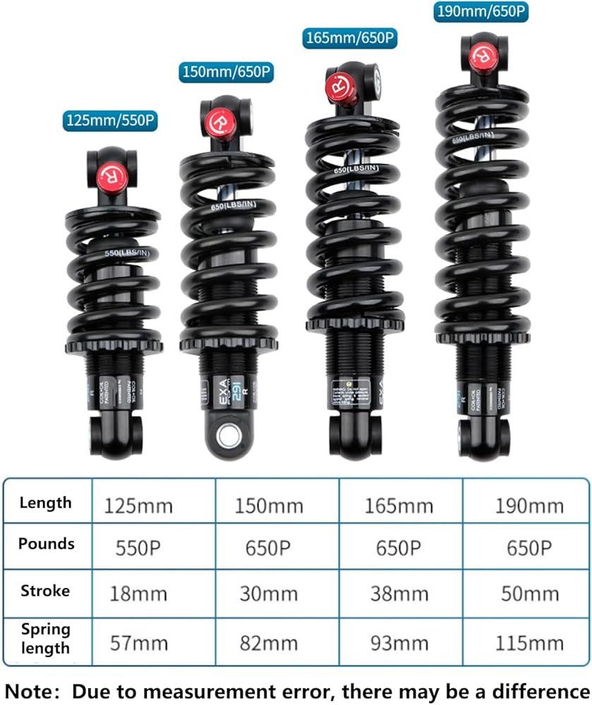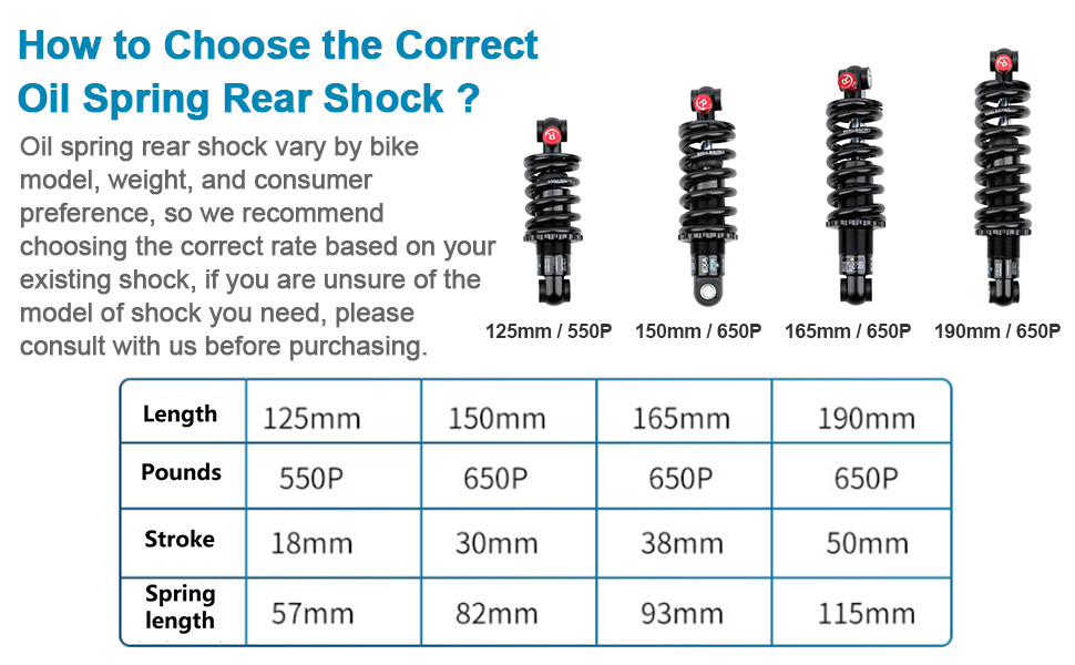 المقاس: ممتص الصدمات الخلفي MTB متوفر بالطول والرطل: 125 مم × 550 رطل، 150 مم × 650 رطل، 165 مم × 650 رطل، 190 مم × 650 رطل، يرجى قياس حجم ممتص الصدمات الخاص بك قبل الشراء للمطابقة.