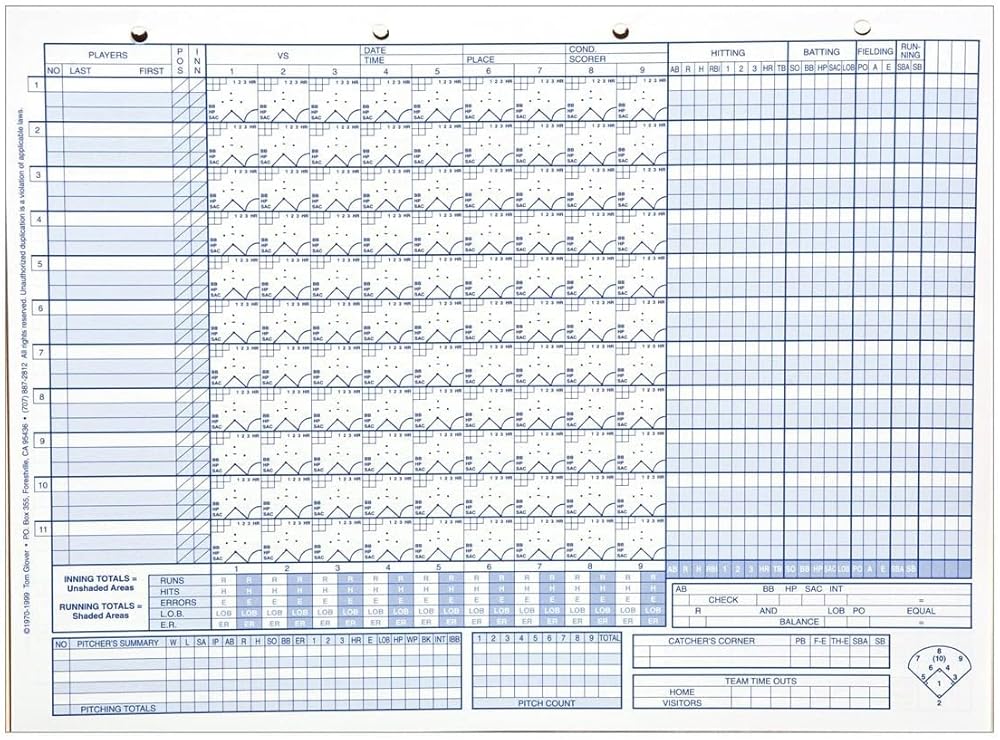 Glover's BB-100 is a detailed play-by-play score sheet book providing visual play record, inning summaries, pitching summaries, pitch count to meet league tracking requirements, catching summaries, unique "Check-and-balance" section for accurate scoring, and extra Inning tear-out sheets