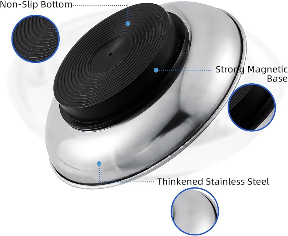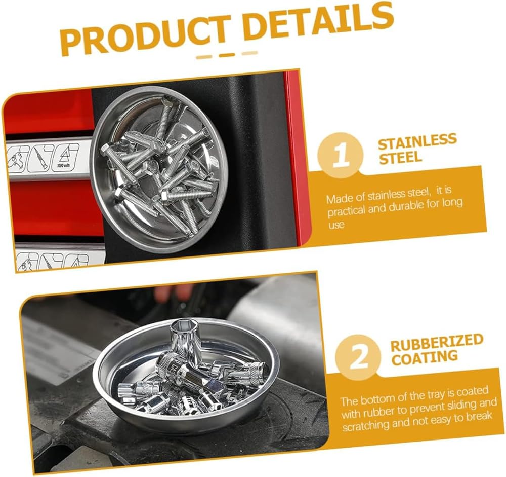 Smooth stainless-steel trays have powerful ceramic magnets with rubber covers in the base to secure them to a metal toolbox or table while keeping important metal pieces at hand.