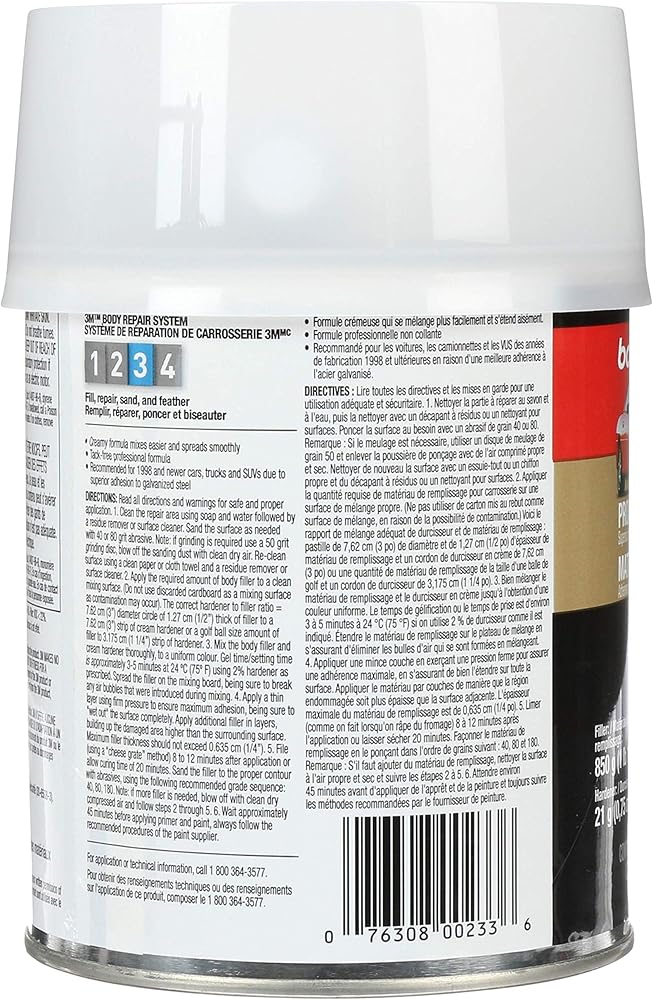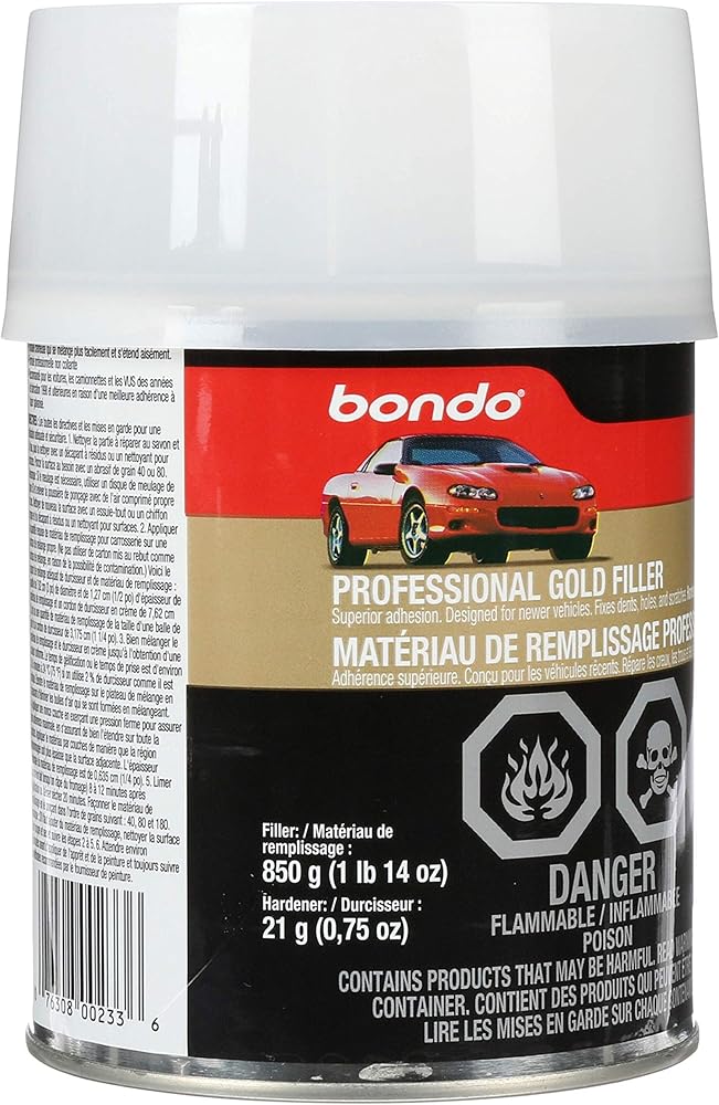 Bondo Professional Gold Filler is adhesion promoted for double-coated galvanized steel used on newer vehicles, plus aluminum, fiberglass, SMC and more. Advanced 3M resin technology makes it extremely easy to mix with the included hardener, and it applies smoothly and is easily sandable in minutes. The result: Simpler professional-grade auto body repairs in garages of any size.