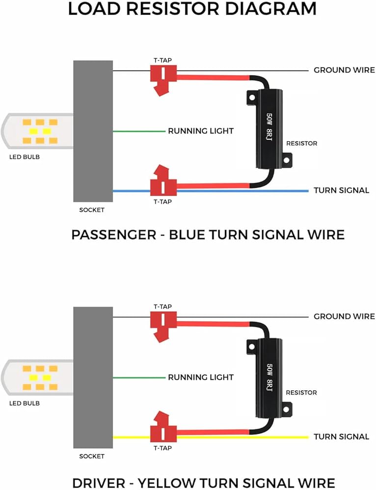 Whether you're grappling with LED-related problems such as hyper flashing or burnt-out bulbs, our load resistors offer a worry-free solution for your road trips. Typically, each turn signal or license plate light requires one of these LED resistors to ensure optimal functionality.