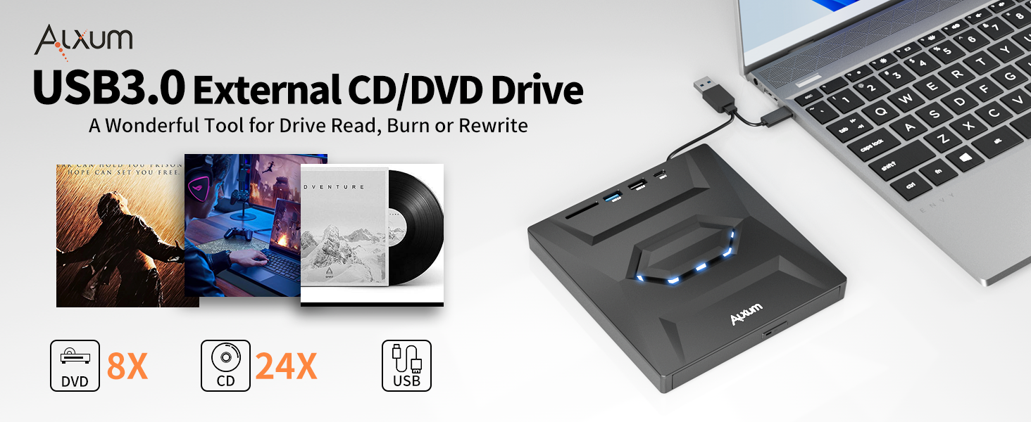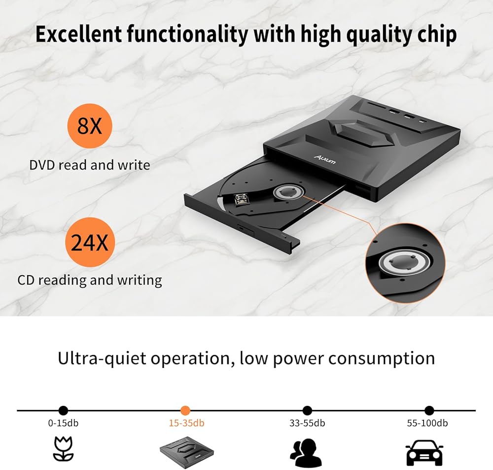 نقل بيانات سريع وفعال: مع منفذ USB 3.0 عالي السرعة، يوفر محرك أقراص CD/DVD الخارجي هذا معدل نقل يصل إلى 5 جيجابت في الثانية. متوافق مع USB2.0، USB1.1. سواء كنت تقوم بنقل ملفات كبيرة أو نسخ أقراص، فإن إمكانيات النقل السريع للبيانات تضمن تجربة سلسة. (ملاحظة: غير متوافق مع أجهزة iPad أو الهواتف أو أجهزة Chromebook أو أجهزة التلفاز أو السيارات أو أقراص Blu-ray)
