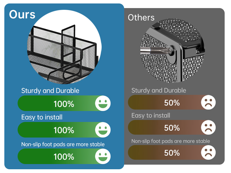 مادة عالية الجودة - منظم المكتب الخاص بنا مصنوع من شبكة معدنية صلبة، واللحام قوي جدًا، ومجهز بتقنية طلاء احترافية، والسطح أملس ورقيق ومتين للغاية، بالإضافة إلى وسادات مطاطية غير قابلة للانزلاق لمنع الانزلاق وتجنب خدوش السطح. إنه ديكور مكتبي متين.