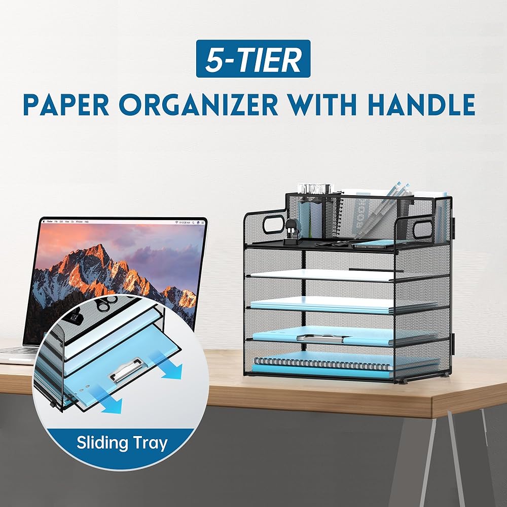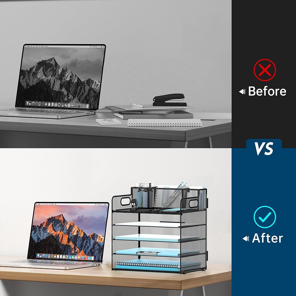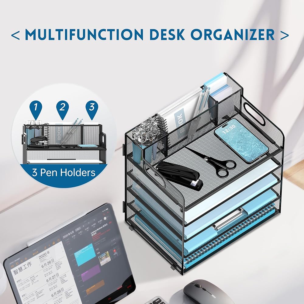 توفير المساحة - يمكن لمنظم صينية الحروف الورقية هذا مع حامل القلم أن يساعدك على استخدام مساحة العمل الخاصة بك بشكل أكثر كفاءة. مع منظم سطح المكتب الخاص بنا، يمكنك الحصول على مكتب أكثر تنظيمًا مع كل شيء في مكانه للحصول على مساحة عمل أكثر راحة، كما أنه إكسسوار مكتب مثالي.