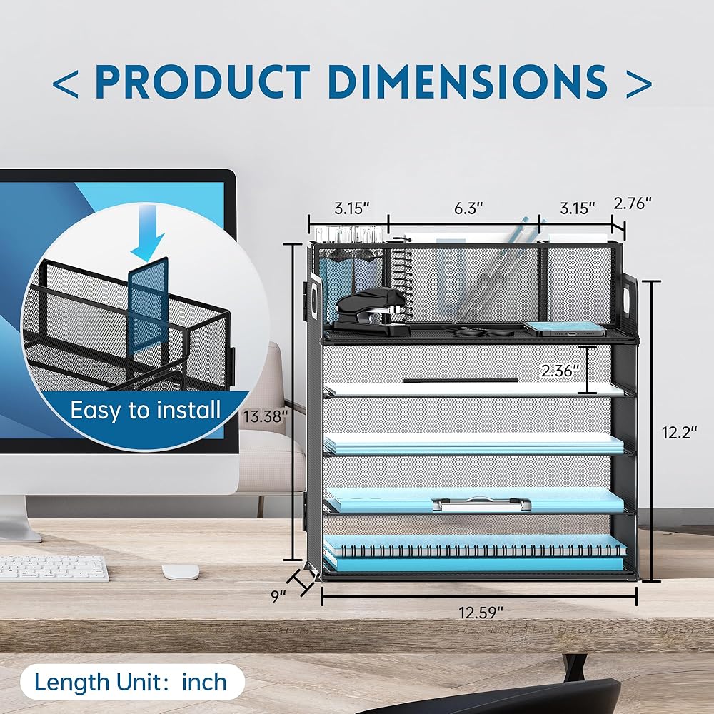 سهل التجميع - كل إجراء تركيب لمنظم الورق هذا واضح وبسيط. يتم تضمين مفك البراغي أيضًا. لن يستغرق الأمر سوى بضع دقائق لتجميع منظمات المكتب وملحقاته. تم تصميم حجرة حامل القلم بإدخالات، ويمكن تصميم مساحة التخزين حسب الرغبة.