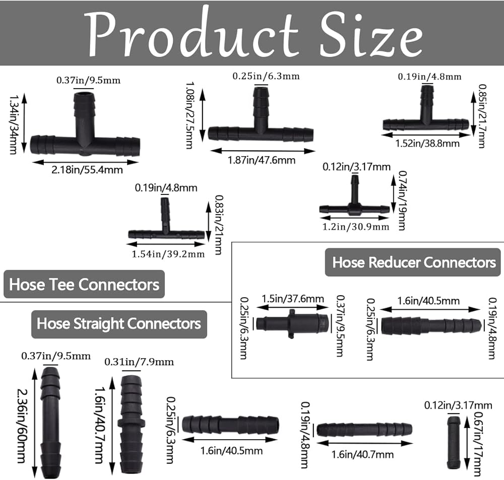• There are five sizes of tees: 15pcs 15pcs--3.17×3.17×3.17mm, 8pcs-3.9× 3.9mm, 8pcs-4.8× 4.8mm, 5pcs-6.3× 6.3× 6.3mm, 3pcs-9.5. There are five kinds of through sizes: 40pcs--3.17×3.17mm, 10pcs--4.8×4.8mm, 6pcs--7.9×7.9mm, 10pcs--6.3×6.3mm, 8pcs--9.5×9.5mm;; The reducer includes two sizes: 10pcs--4.8×6.3mm, 5pcs--6.3×9.5mm