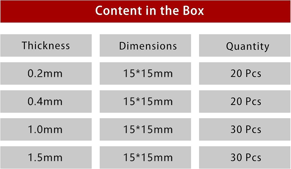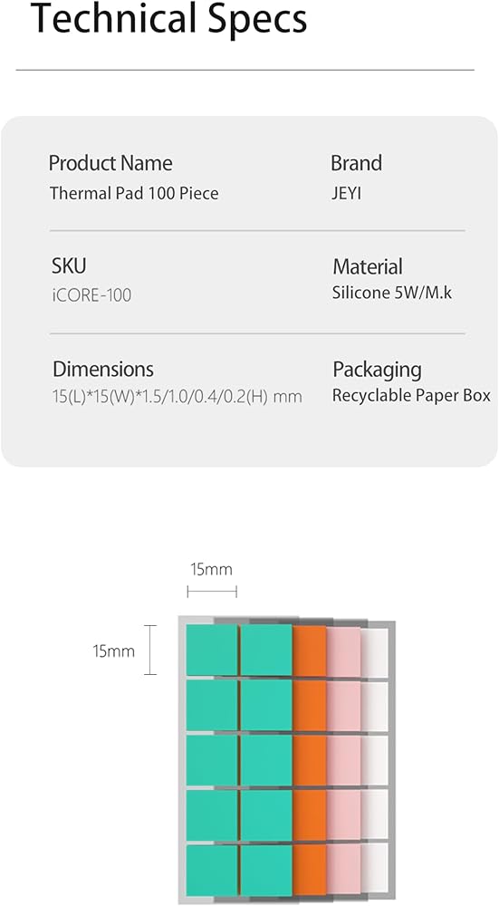 JEYI 100 قطعة مقطوعة مسبقًا 0.6 × 0.6 بوصة (15 × 15 مم) وسادة حرارية من السيليكون بسمك 0.2 0.4 1.0 1.5 مم سمك وسادة سيليكون موصلة حرارية قابلة لإعادة الاستخدام لوحدة المعالجة المركزية GPU SSD أو أي PCB (ألوان متنوعة وسمك)