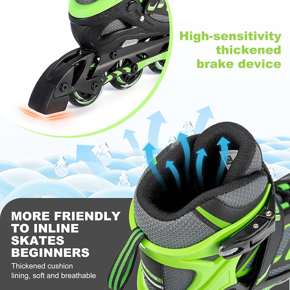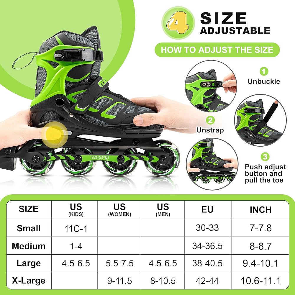 • 【زلاجات مضمنة قابلة للتعديل 】 (يُرجى التأكد من المقاس قبل تقديم الطلب). تحتوي الزلاجات المضمنة لدينا على 3 مقاسات مختلفة للجنسين، M/L/XL، وكل مقاس قابل للتعديل، يرجى التأكد من اختيار المقاس الصحيح من خلال التحقق من المقاس المرفق صور الرسم البياني. ولا تنس تعديل طول الحذاء بالضغط على الزر قبل ارتدائه، فستجد أنه مريح جدًا في التشغيل، ويمكن للأطفال والشباب استخدامه لسنوات عديدة حتى مع نمو أقدامهم.