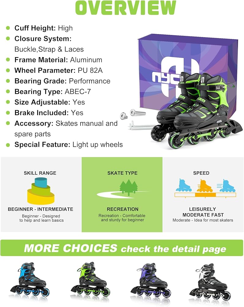 • متين وناعم: إطار التزلج المضمن من NYCTUS مصنوع من سبائك الألومنيوم المعززة. مع عجلات البولي يوريثين 82A عالية الارتداد ومحامل ABEC-7 عالية السرعة، يمكنك الاستمتاع بتزلج سلس وهادئ ومريح.