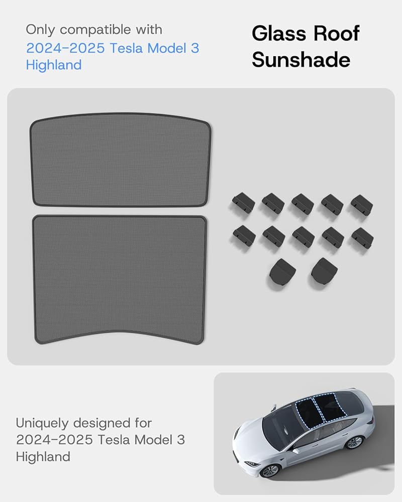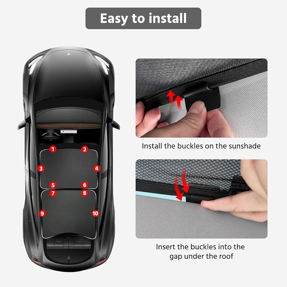 【Easy to Install】The improved version of the Model 3 sunroof sunshade kit has specially designed clips which are more solid and has been pre installed on the sunshade, making installation easier and faster. You only need to insert all the clips into the gaps under the sunroof and slightly slide the clips to adjust their position to finish the install.