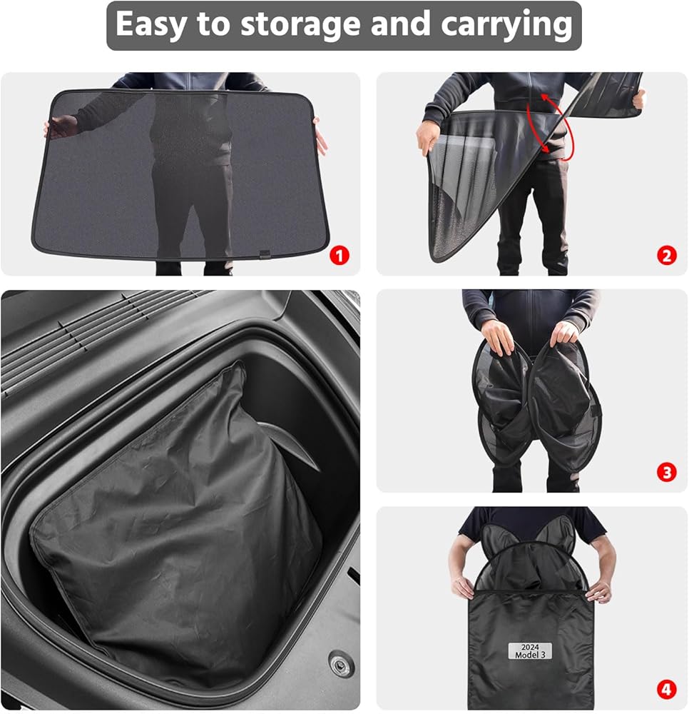 【Easy to Store】The tesla model 3 roof sunshade comes with a storage bag. Two black mesh sunshades and two silver coated shades can be folded, and after folding, placing them in this storage bag can greatly reduce space occupation.