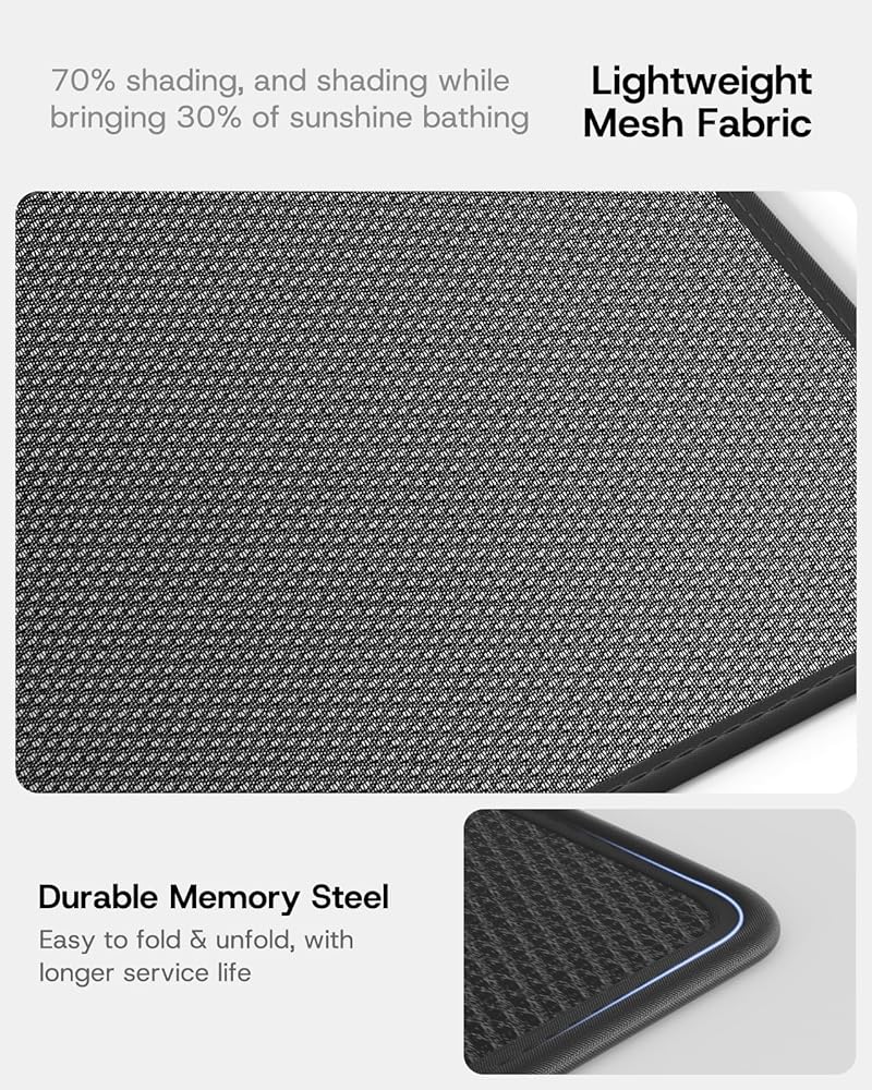 【Easy to fold and unfold】SUMK Tesla model 3 glass roof sunshade adopts the memory steel frame of more high quality. This type of steel material is more thiner and has better toughness, so it's more easier to operate, and can be easily installed or folded without requiring a lot of force. And this material can withstand more folding times and has a longer service life.