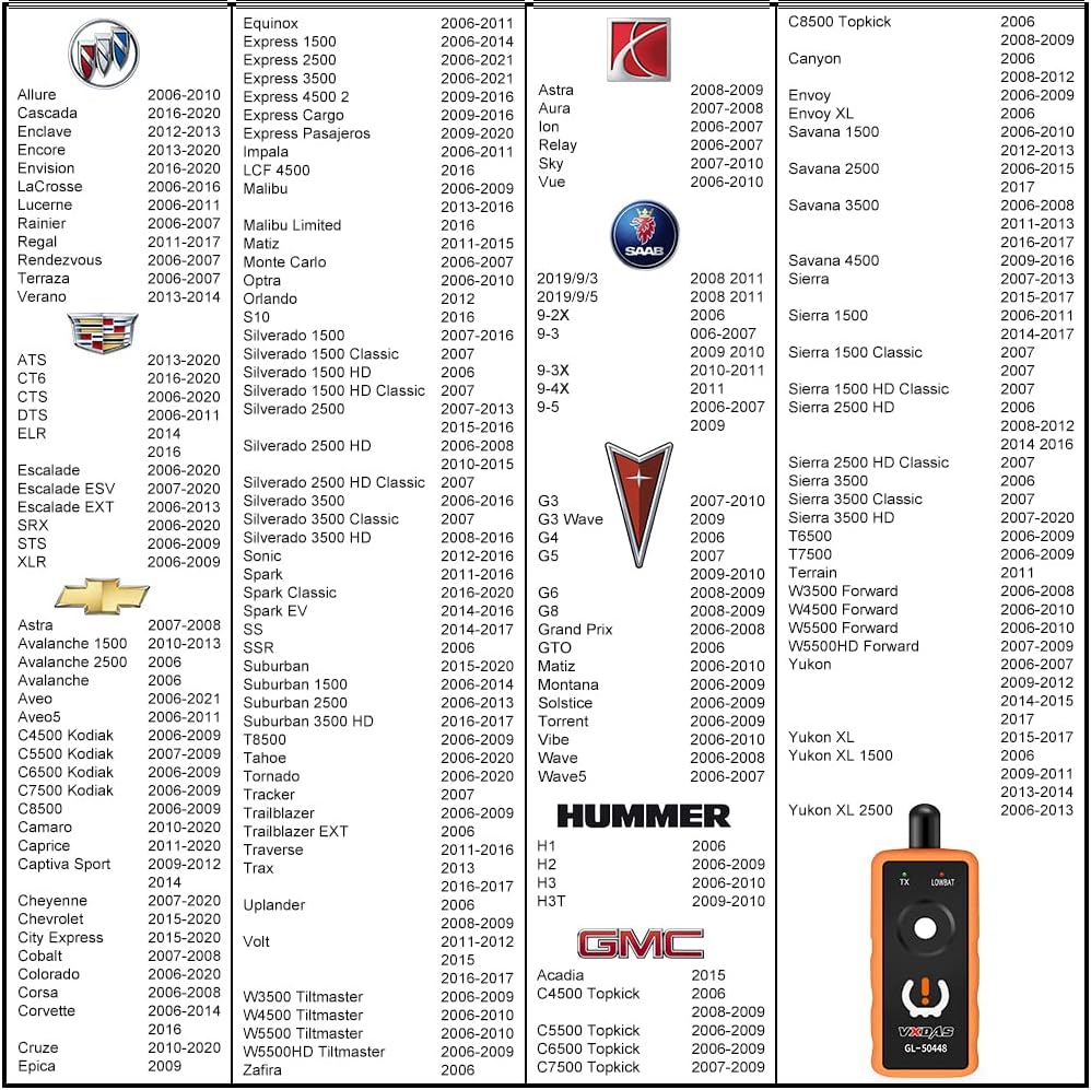 • 【لأداة إعادة تعلم ضغط الإطارات من جنرال موتورز】: GL50448 هي أداة أساسية كبديل لمستشعر ضغط الإطارات، أو مزيل منبه ضغط الإطارات أو لتبديل الإطارات. يعمل على معظم GM 2006-2023 (Chevy/Buick/GMC/Opel)
