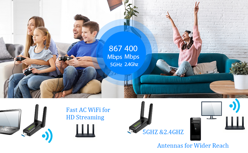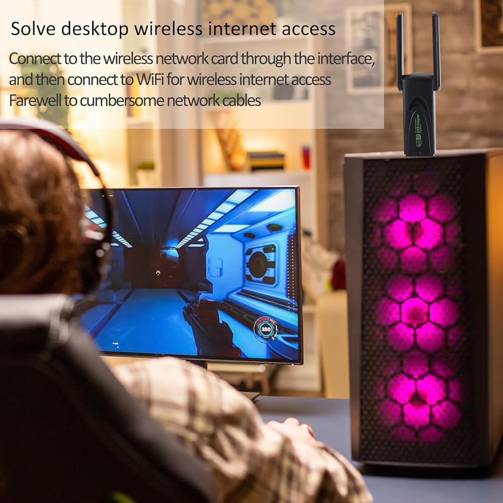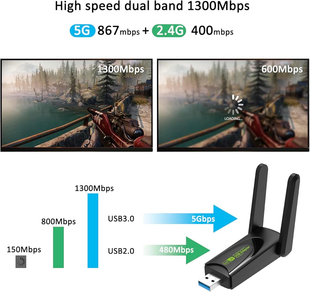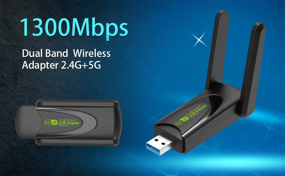 محول واي فاي USB 1.1300 ميجابت في الثانية: محول واي فاي عالي السرعة 1300 ميجابت في الثانية 5G/2.4G USB مناسب للكمبيوتر الشخصي، دونجل واي فاي ثنائي النطاق، حتى 867 ميجابت في الثانية في نطاق التردد 5 جيجا هرتز وما يصل إلى 400 ميجابت في الثانية في نطاق التردد 2.4 جيجا هرتز. لا يوجد دعم للتلفزيون.