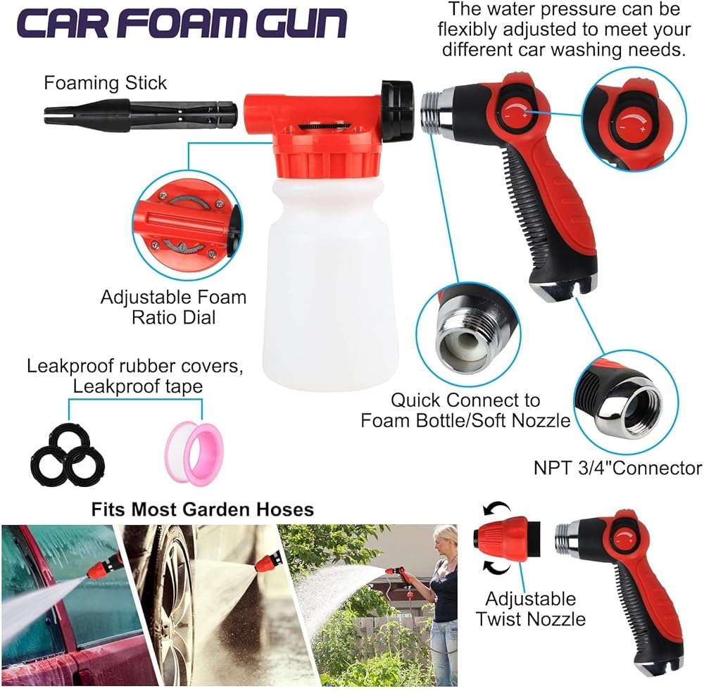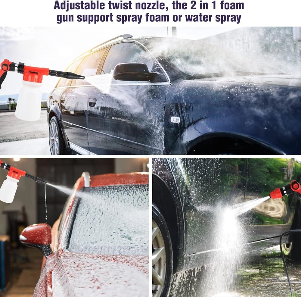 ضغط مياه قابل للتعديل - مع فوهة ملتوية قابلة للتعديل، مسدس الرغوة 2 في 1 يدعم رش الرغوة أو رذاذ الماء. أضف بعض الصابون والماء إلى الحاوية ذات السعة الكبيرة، وقم بتوصيل خرطوم الحديقة، ثم يمكنك البدء في غسل سيارتك. يتميز مسدس الرغوة بوجود أداة ضبط على المقبض لضبط ضغط الماء بمرونة لتلبية متطلبات غسيل السيارة المختلفة.