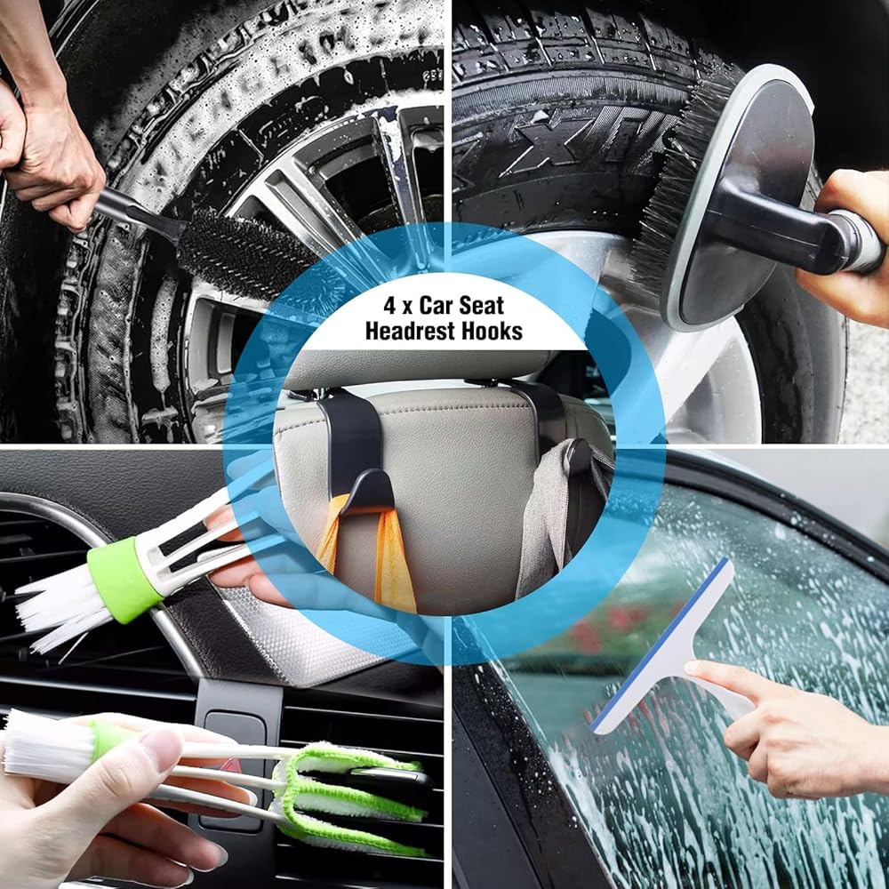 تنظيف السيارة داخليًا وخارجيًا - يمكن لفرشاة العجلة الوصول إلى الأماكن التي يصعب الوصول إليها وتنظيفها بزاوية 360 درجة. تعمل فرشاة المنفضة على تنظيف جزيئات الأوساخ والأوساخ بلطف بعيدًا عن لوحة القيادة ومقاعد السيارة. تمتد فرش التفاصيل بسهولة إلى الشقوق الصغيرة للتنظيف العميق. تقوم الفرش السلكية بتنظيف الأوساخ العنيدة بشكل أكثر دقة. يكفي قفاز غسيل شانيل سميك ومنشفتين كبيرتين للغاية فائقة الامتصاص لتنظيف وتجفيف السيارة بأكملها.
