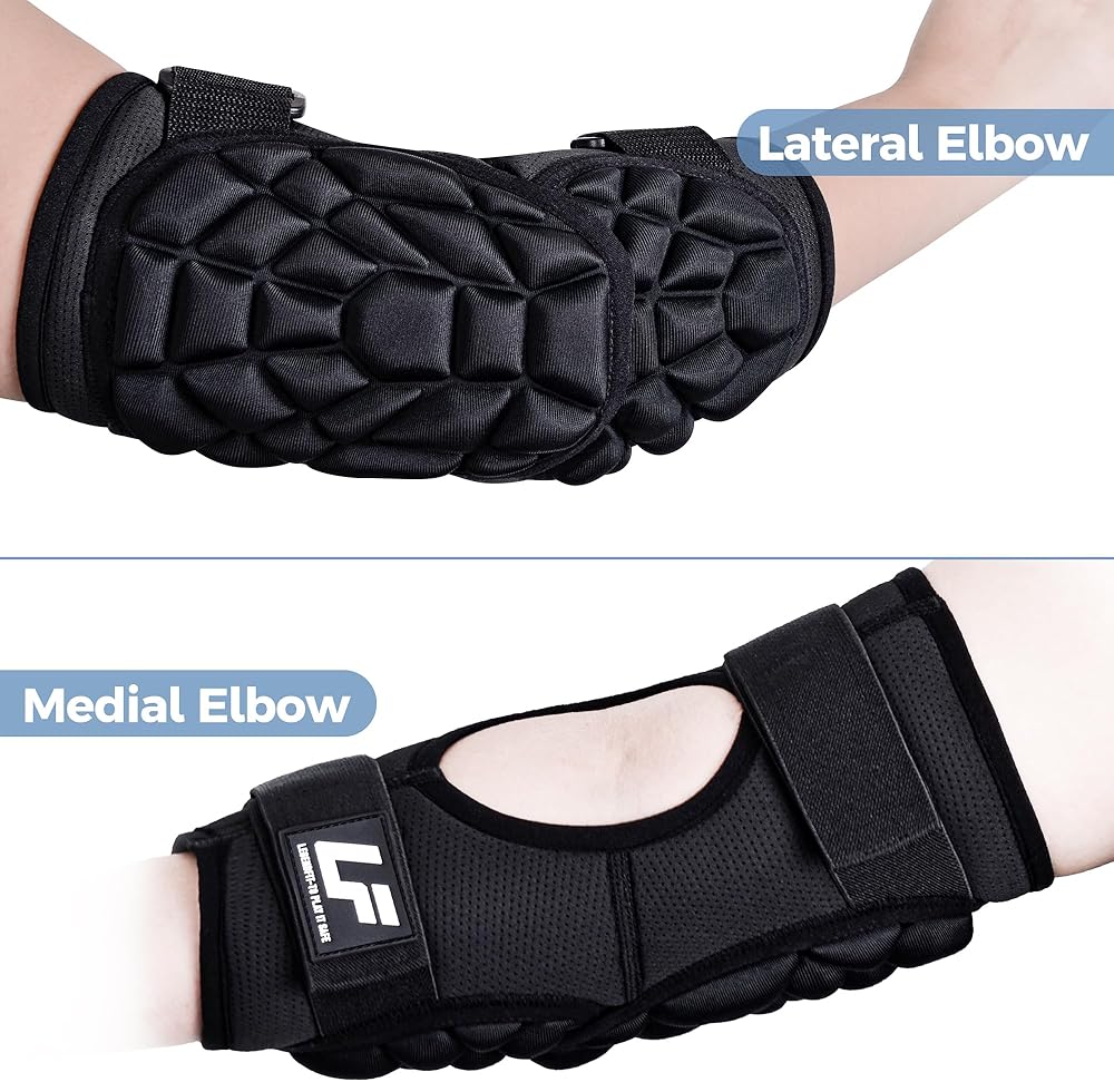 نسيج قابل للتنفس والغسيل: 90% SBR + 10% نايلون - واقيات الكوع الخاصة ببطارية LEGENDFIT مصنوعة من نسيج مسامي ومثقوب يعزز الراحة العامة والمرونة لحاميات الذراع. يستخدم هذا المنتج تقنية حشو EVA التي تحافظ على دعم الوسادات حتى بعد غسلها في الغسالة.