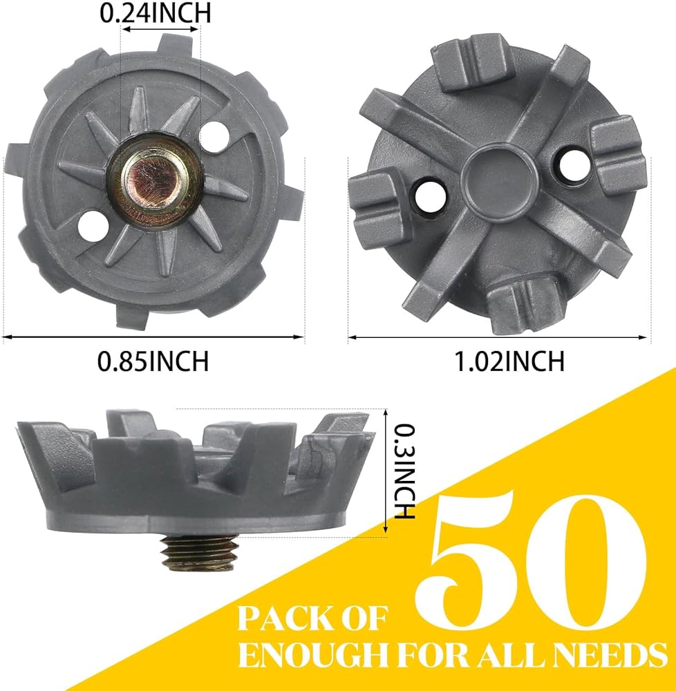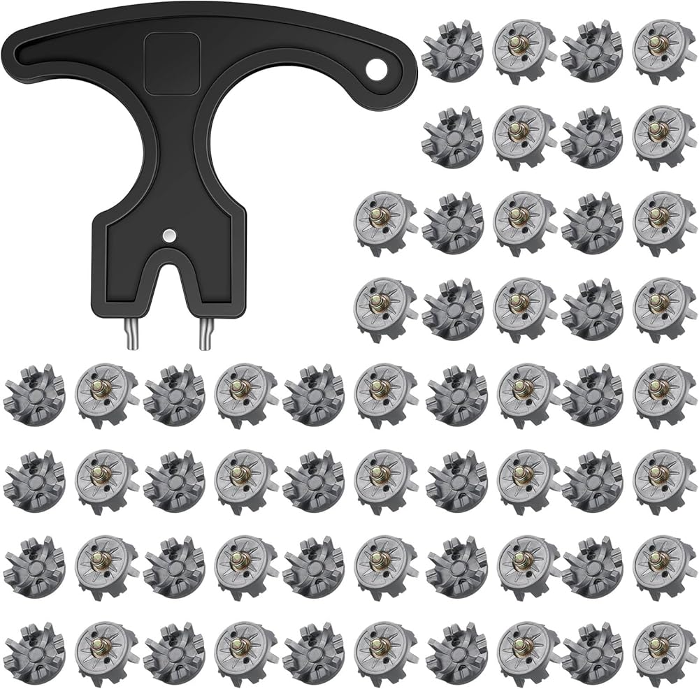 Golf Shoe Spikes Replacements Set: includes 50 golf cleats and 1 golf nail wrench so ample quantity ensures you don't run out of replacements quickly, comes with 1 wrench that makes the cleats easy to install and replace