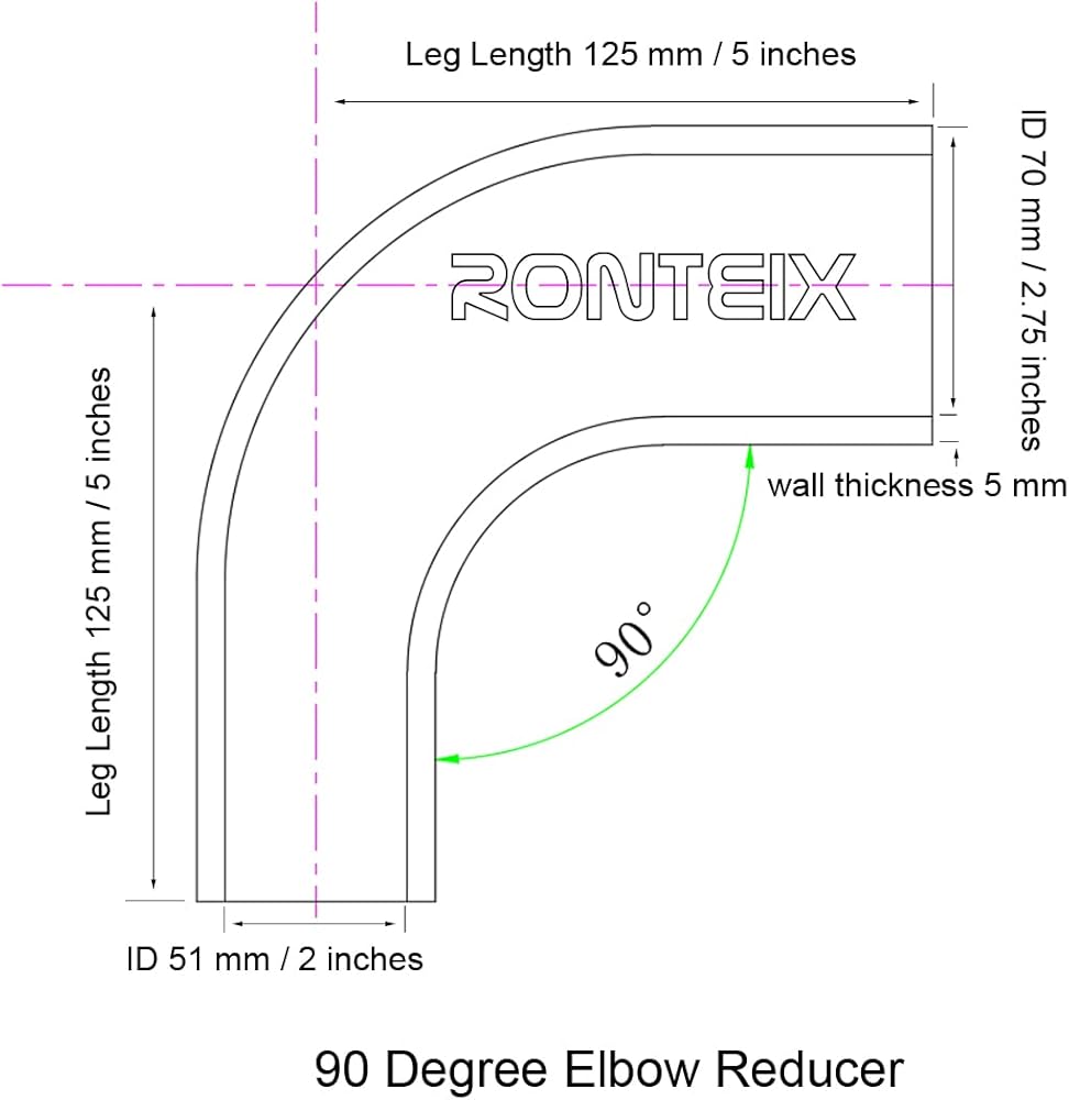خرطوم سيليكون مخفض 90 درجة من Ronteix Universal معرف 2 بوصة إلى 2.75 بوصة (51 مم - 70 مم)