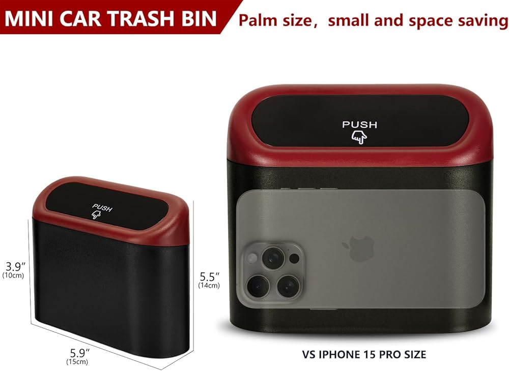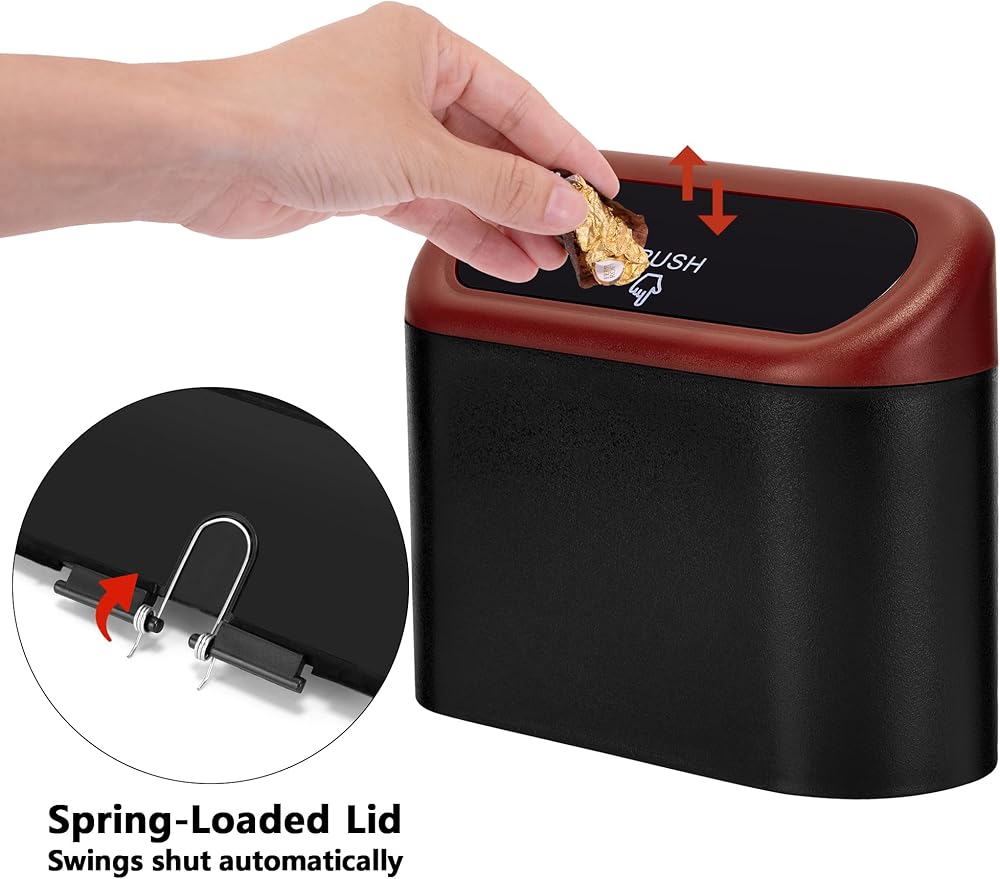 [تصميم مانع للتسرب] - يمكن أن يحتوي غطاء سلة مهملات السيارة على غطاء مزود بنابض: اضغط عليه لأسفل لإدخال سلة المهملات الخاصة بك، ويقلب مرة أخرى إلى الوضع المغلق لمنع انسكاب قمامة سيارتك. يمكن لصندوق قمامة السيارة أن يحبس أي رائحة كريهة بشكل فعال ويبقي سلة مهملات السيارة بعيدة عن الأنظار. يمكن أن تحافظ سلة المهملات هذه على سيارتك مرتبة ونظيفة.