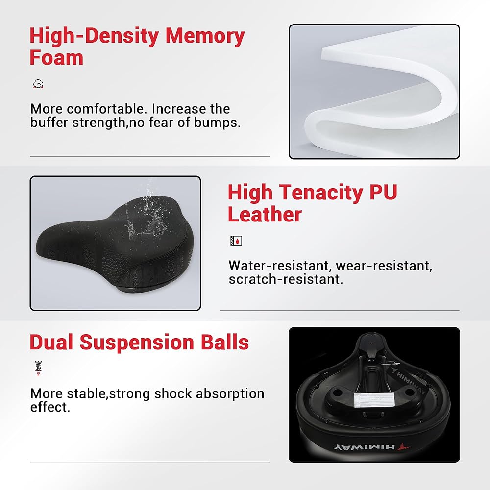 • 【مريح وممتص للصدمات】مقعد الدراجة المريح للغاية مبطن بإسفنج الذاكرة السميك الموسع عالي الكثافة مع جلد متين مقاوم للماء، مع كرة مطاطية مضادة للصدمات أسفل مقعد الدراجة تحميك من الحدة بين شقوق الطريق والصدمات والصقيع. متين، يشعر بالراحة، مرن جيد وناعم جدًا، يحمي الأرداف بشكل أفضل! إنه مصمم لكل من الرجال والنساء للاستخدام الداخلي والخارجي.