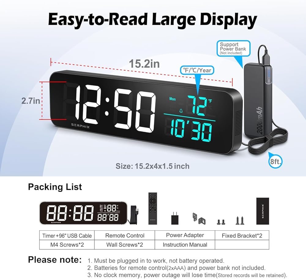 【وظيفة الساعة الرقمية】يمكنها عرض الوقت/التاريخ/درجة الحرارة، ودعم ما يصل إلى 10 منبهات، وتنسيق 12/24 ساعة، وتبديل فهرنهايت ودرجة مئوية، ومزامنة الوقت التلقائي عبر البلوتوث، ويأتي مع كابل طاقة USB يزيد عن 95 بوصة.