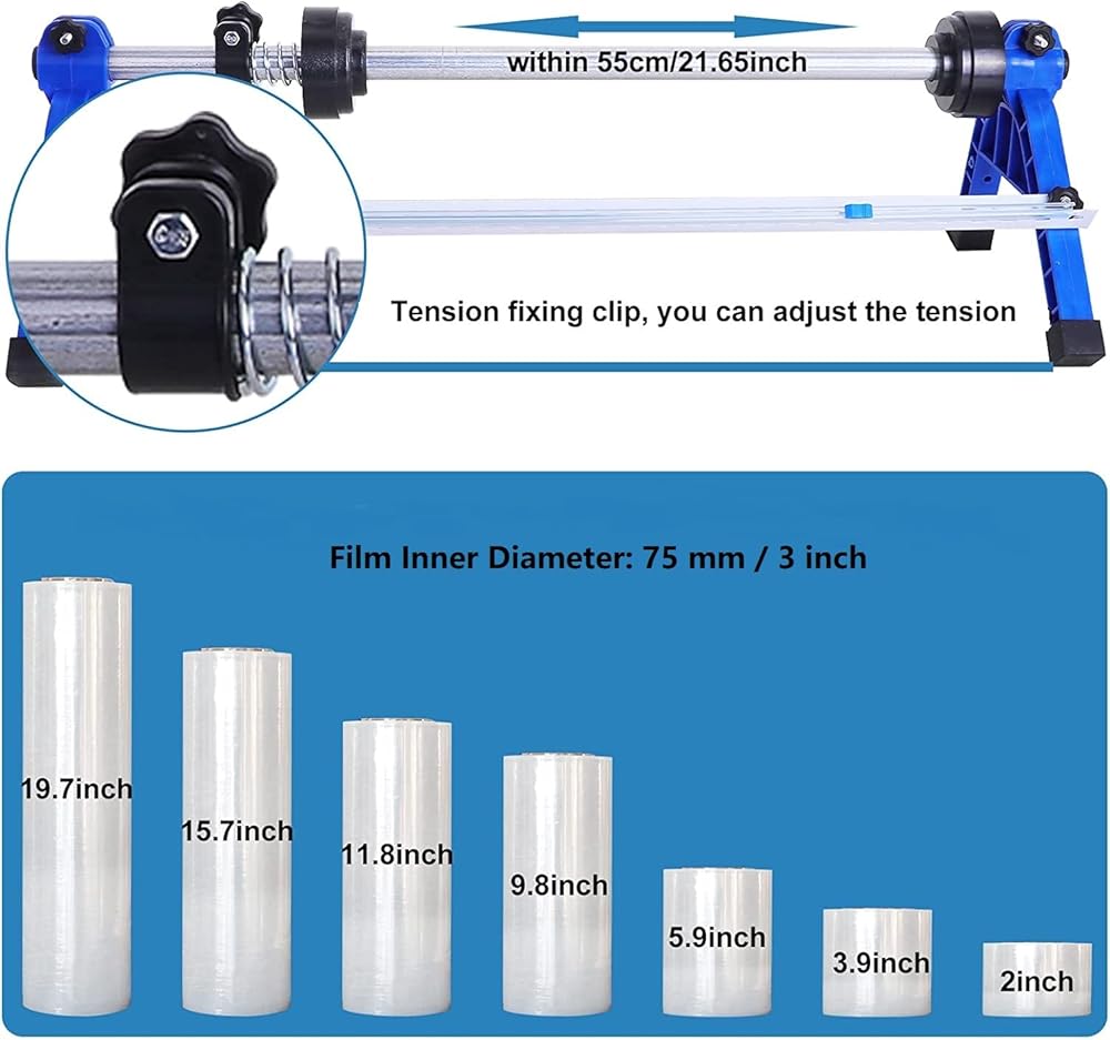 آلة التغليف الممتدة هذه مناسبة لمختلف أفلام التمدد التي يبلغ عرضها 55 سم / 21.65 بوصة. القطر الداخلي للفيلم: 75 مم/3 بوصة.