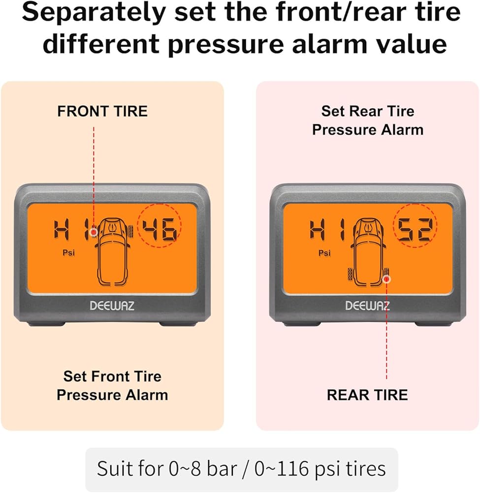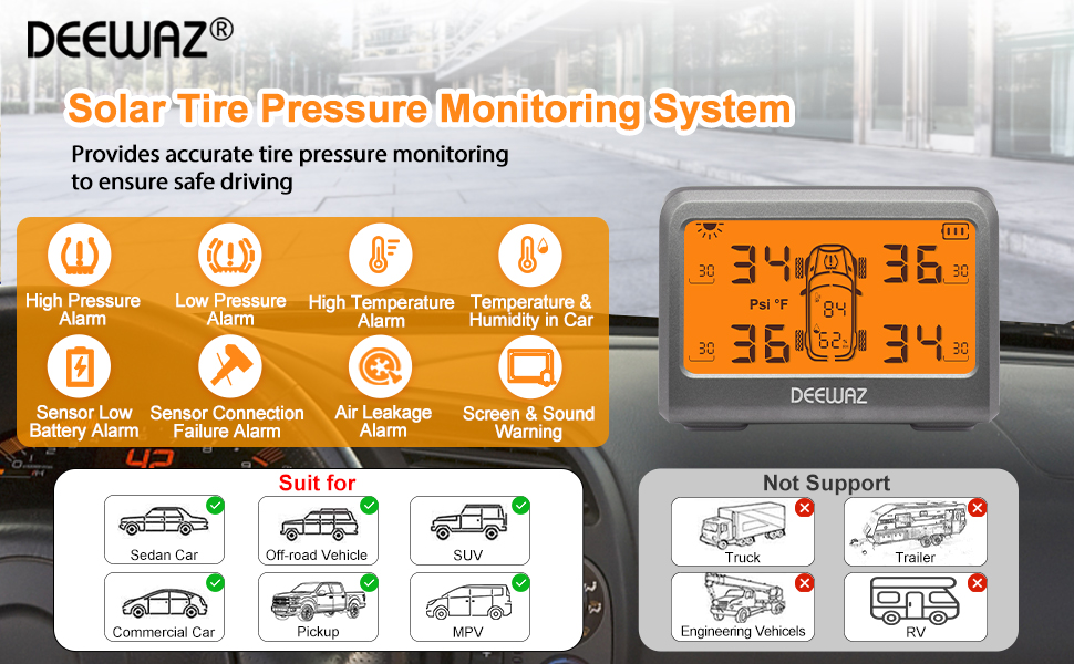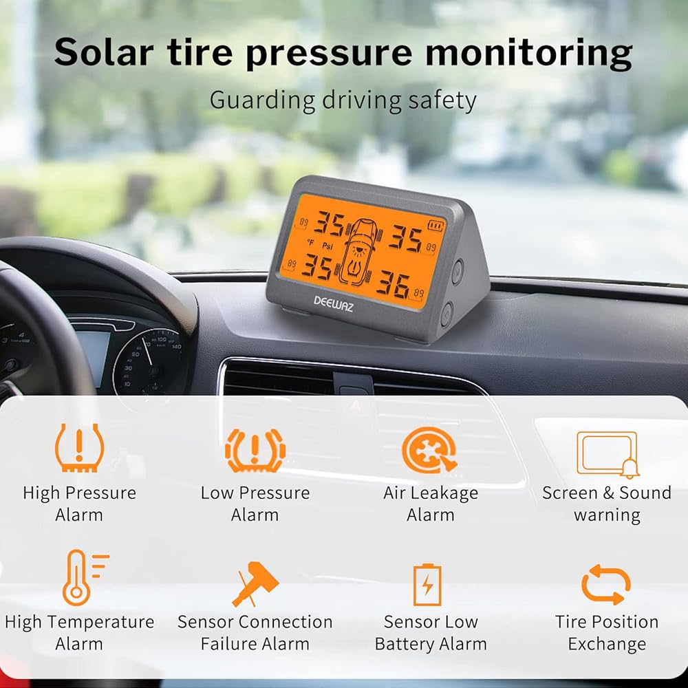 نظام مراقبة ضغط الإطارات، DEEWAZ MY77T Solar TPMS، نظام مراقبة ضغط الإطارات مع 4 أجهزة استشعار TPMS داخلية، 0-116 رطل لكل بوصة مربعة لسيارة SUV MPV بيك اب سيدان على الطرق الوعرة