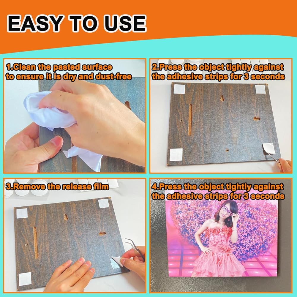 【مجموعة واسعة من التطبيقات】يمكن استخدام هذه الأشرطة اللاصقة لتعليق الصور، وإطارات الصور خفيفة الوزن، والملصقات، والبالونات، والأشياء الصغيرة لتزيين الغرفة، والسجاد، ويمكن أيضًا لصق الحرف الفنية والأظرف. إنه ضروري للمنزل والمكتب والمدرسة والحفلات والزفاف والديكور.