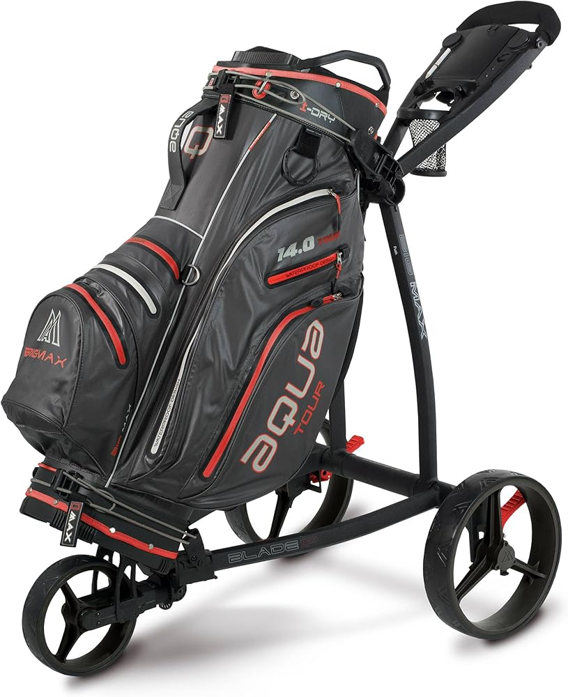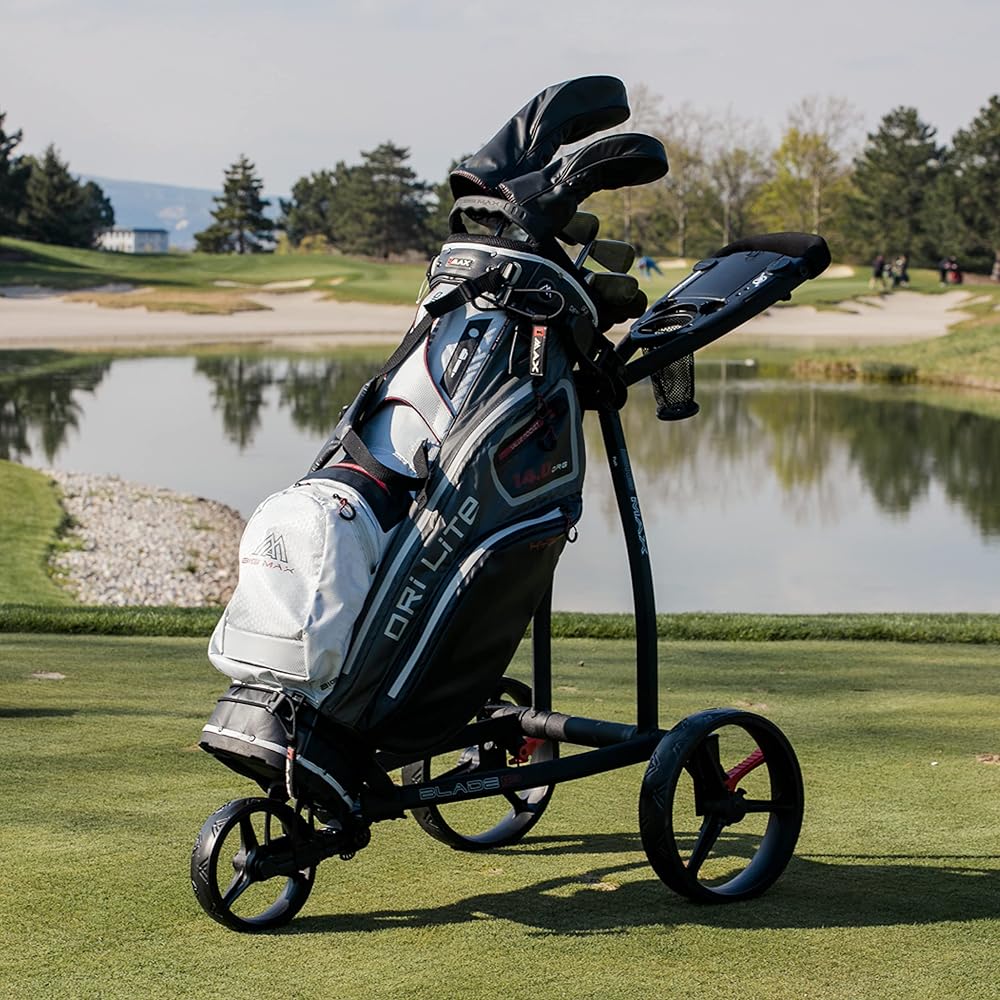 عربة دفع الجولف Big Max Blade IP: 3 عجلات قابلة للطي، خفيفة الوزن للغاية، تقنية قابلة للطي بشكل مسطح، تصميم متين وبسيط، لوحة تنظيم ذكية مع مساحة تخزين كبيرة لملحقات الجولف