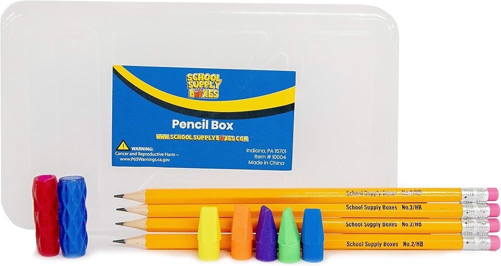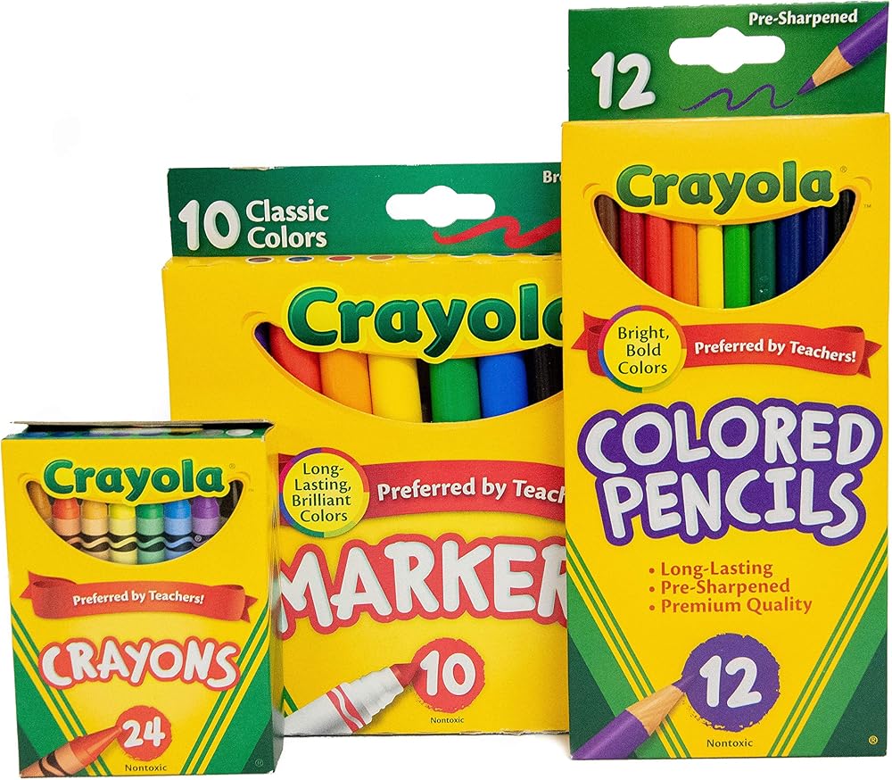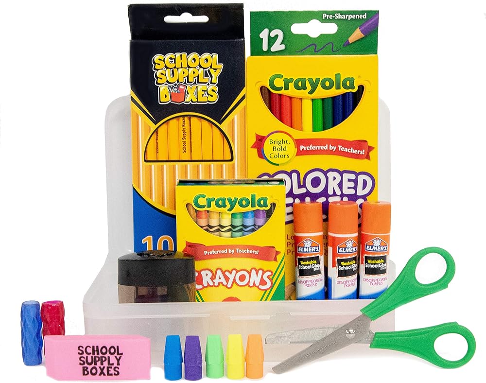 Take one hassle out of back to school shopping and buy a School Supply Box filled with everything your elementary student needs. This supply kit contains (1) plastic pencil box, (1) 10pk of Crayola Markers, (1) 24pk of Crayola Crayons, (1) 12pk of colored pencils, (3) Elmer's glue sticks, (10) #2 pencils, (5) pencil top erasers, (1) rubber eraser, (1) pencil sharpener, (1) pair of blunt tip scissors, (2) pencil grips, (1) standard 12 inch ruler, (1) wide-rule spiral notebook, (1) wide ruled composition book, and (2) 2-pocket folder with metal prongs. This massive school supply kit contains everything your child in kindergarten, first grade, second grade, third grade, fourth grade, or fifth grade could need for the first day of school. The art supplies in this school supply box are great for your young artist to use on art projects, map projects, coloring pages, coloring books, assignments, or for making holiday decorations. Poems, stories, essays, spelling tests, math tests, and taking notes won't be a problem on the first day of school with all the writing materials and tools available in this school supply box. School Supply Boxes don't have to just be for school kids. The supply kits also make a great gift for a teacher, substitute teacher, principal, vice principal, tutor, guidance counselor, or for a homeschooled child.