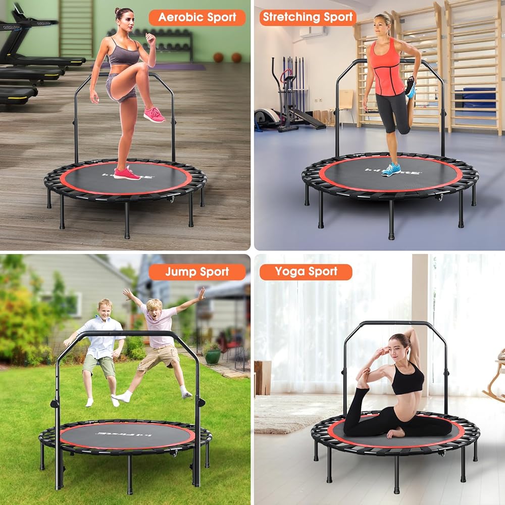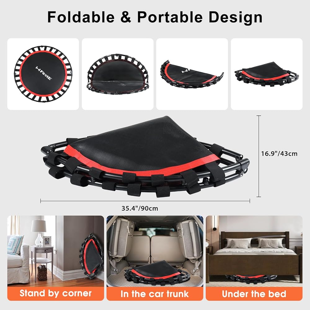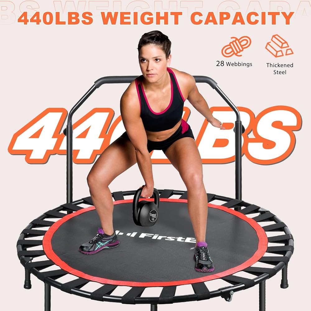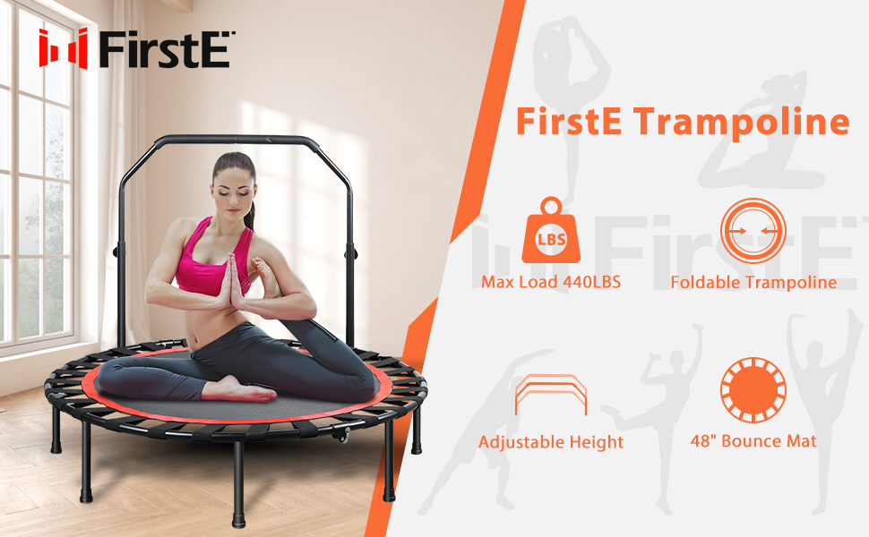 FirstE 48 بوصة بنجي ريبوندر ترامبولين للبالغين، ترامبولين للياقة البدنية بوزن 440 رطل، ترامبولين صغير قابل للطي، 3 مستويات مقبض إسفنجي قابل للتعديل، ترامبولين ثابت وصامت للتمرين للبالغين في الأماكن المغلقة