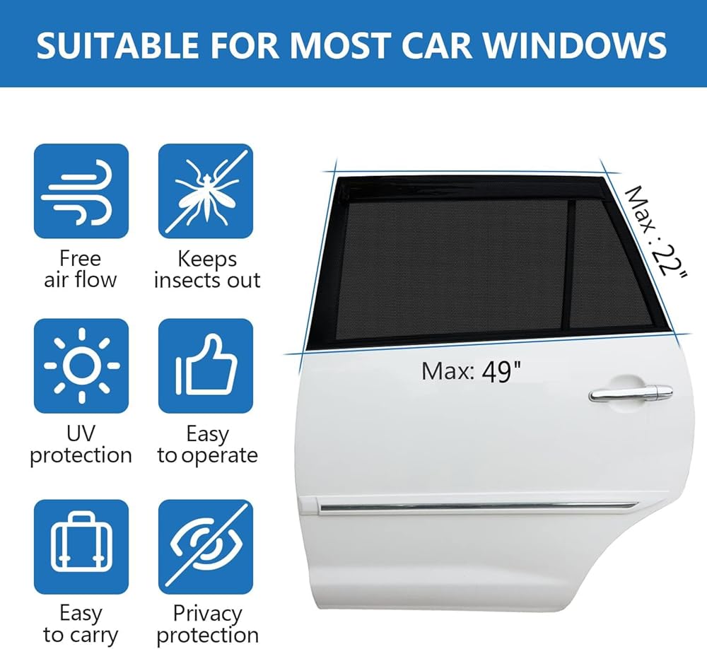 【النافذة لا تزال تتدحرج للأسفل】 تم تصميم ستائر النوافذ للسيارة لتغطية إطار النافذة الخارجي بالكامل دون مساعدة أي مادة لاصقة، مما يضمن حرية تحريك النافذة لأعلى/لأسفل. بالإضافة إلى الشبكة المسامية، يمكنك الاستمتاع بالهواء البارد والمنعش داخل سيارتك دون تحمل حرارة الشمس أو إزعاج بعض الأجسام الغريبة.