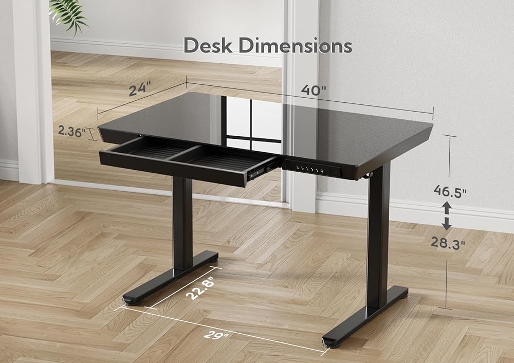 The desk is equipped with a robust motor that smoothly adjusts the height from 28.3 inches to 46.5 inches (including the 2.36-inch desktop thickness) with four programmable height presets for quick and easy customization to your preferred height.